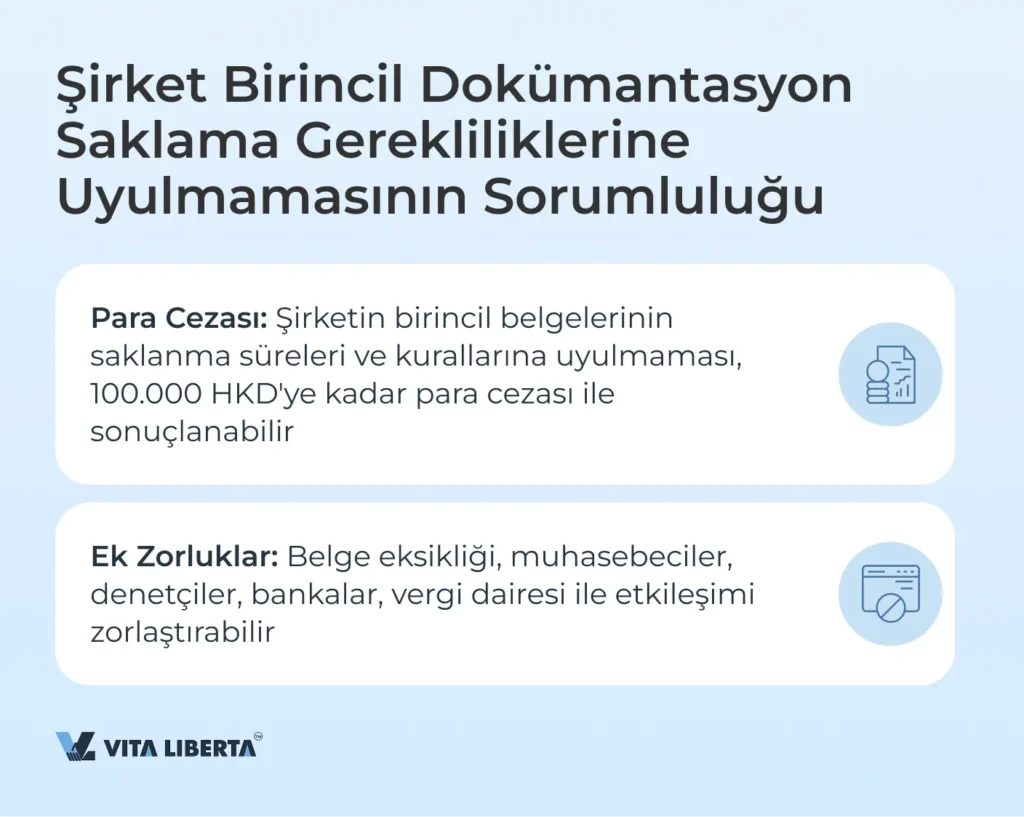 Bir şirket, vergi dairesinin talebi üzerine gerekli belgeleri 7 gün içinde sağlayamazsa, 100.000 HKD’ye varan para cezaları ile karşılaşabilir. Ayrıca, belge saklama kurallarına uyulmaması, ek kontroller ve denetime yol açabilir. Bu nedenle, tüm belgelerin düzenli bir şekilde saklanması ve her an hazır bulundurulması önemlidir.