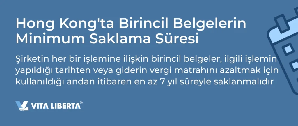 Hong Kong vergi mevzuatı, yani IRO (İç Gelir Yönetmeliği), tüm şirketlerin şirket faaliyetlerine ilişkin birincil belgeleri İngilizce veya Çince olarak saklamasını gerektirir. Bu belgeler, işlem tarihinden itibaren 7 yıl boyunca her an inceleme için hazır bulundurulmalıdır. Bu gerekliliğe uyulmaması, 100.000 HKD’ye kadar para cezası ile sonuçlanabilir.