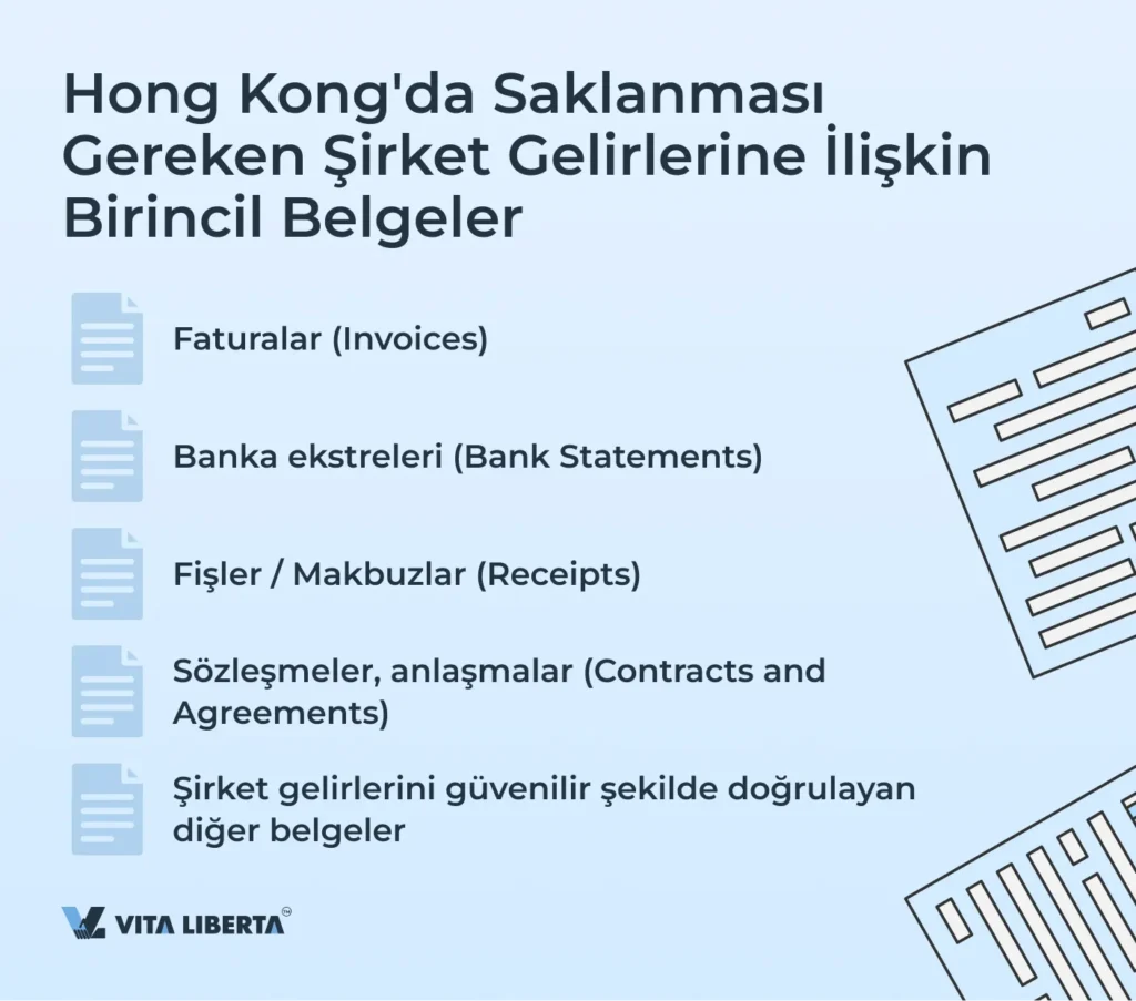 Hong Kong’da şirketler, doğru kayıt tutmayı sağlamak ve iç gelir yasalarına uyum için ciro ve gelirleri doğrulayan birincil belgeleri saklamakla yükümlüdür. Saklanması gereken temel belge türleri şunlardır: