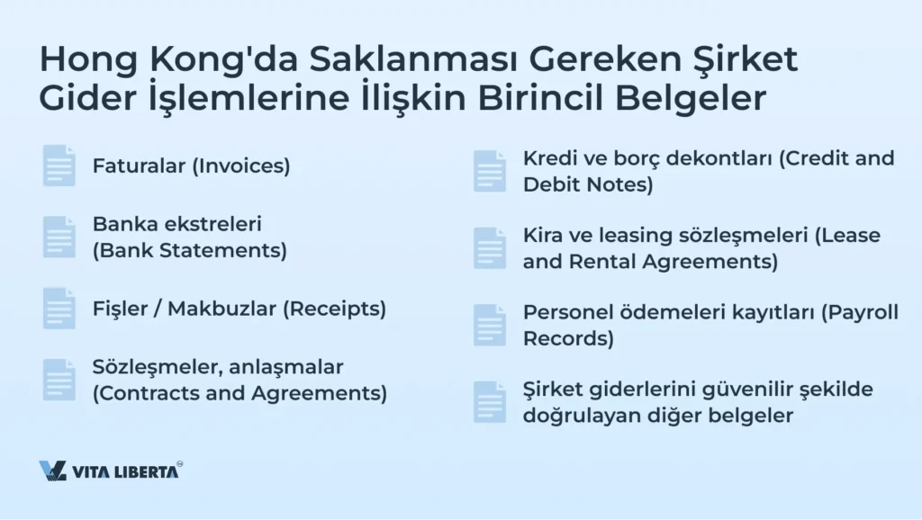 Hong Kong’da şirketler, doğru kayıt tutmayı sağlamak ve vergi gerekliliklerine uyum için giderleri doğrulayan birincil belgeleri saklamakla yükümlüdür. Saklanması gereken temel belge türleri aşağıda listelenmiştir: