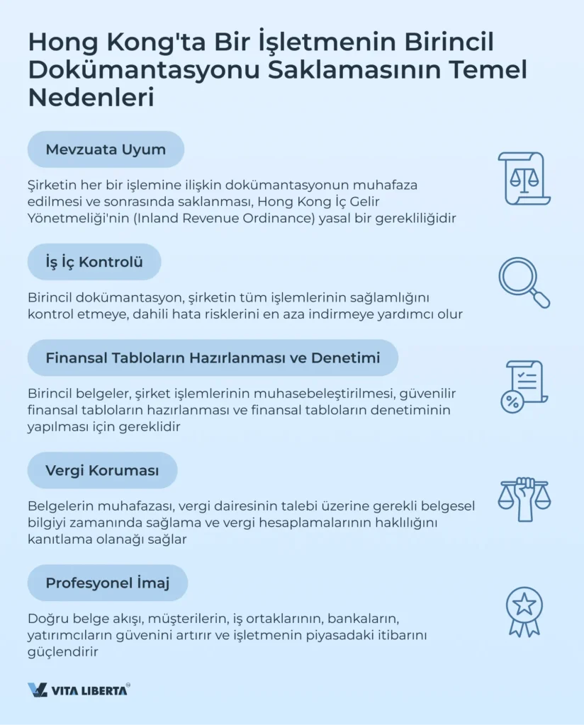 Birincil belgelerin saklanması, şirketin Hong Kong ÖİB topraklarında yasal olarak çalışmasına olanak tanır ve iş yürütmeye ve onun “tarihini” oluşturmaya yönelik sağlıklı bir yaklaşım yaratır. Bu “tarih”, vergi dairelerine, bankalara, yatırımcılara, denetçilere sunulması ve iç kontroller için gerekli olabilir.