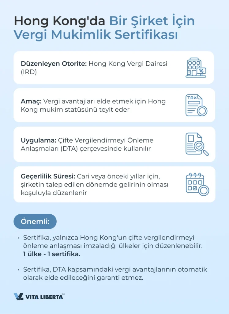 Vergi Mukimlik Sertifikası (Certificate of Residence, CoR), Çifte Vergilendirmeyi Önleme Anlaşmaları (DTA) kapsamında vergi avantajları elde etmek için Hong Kong mukim statüsünü teyit eden bir belgedir. Mukimliğin kanıtı olarak hizmet eder ve Hong Kong’un bu tür anlaşmalar yaptığı ülkeler için cari yıl veya önceki yıl için düzenlenebilir.