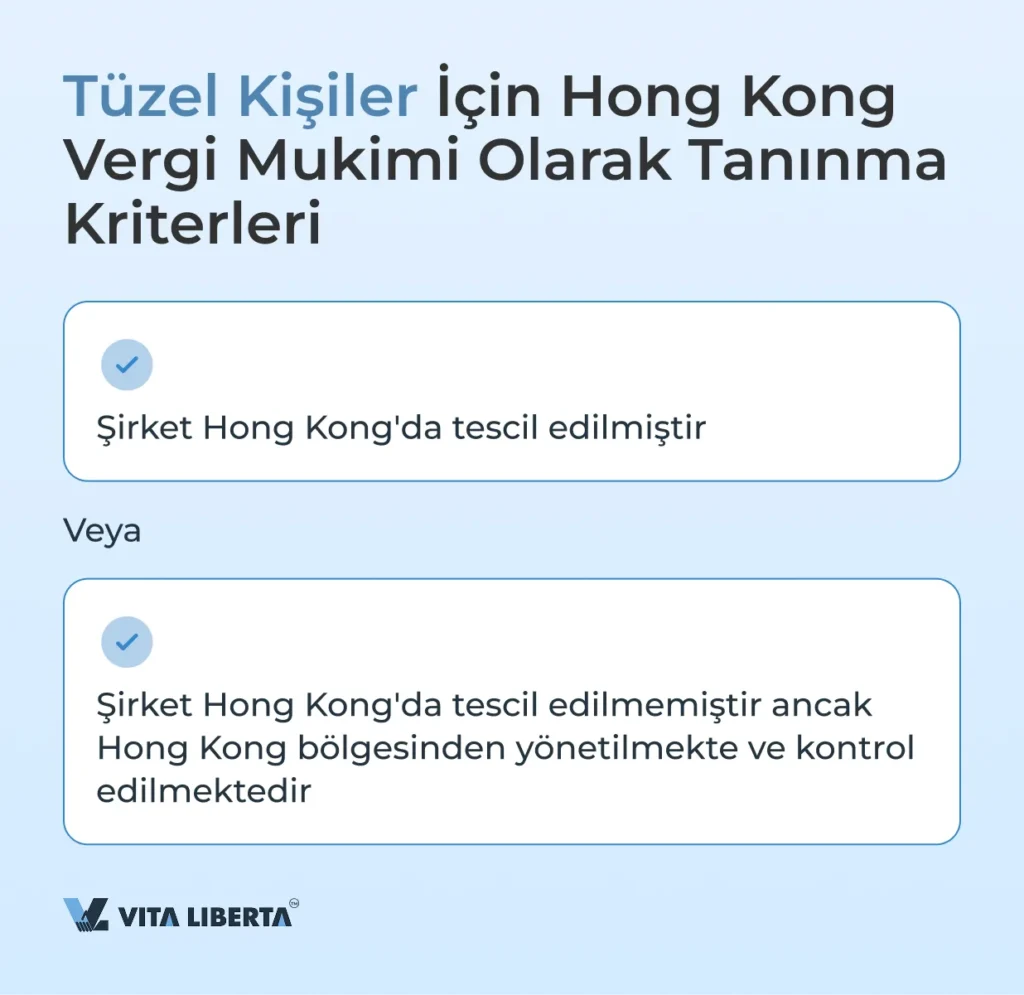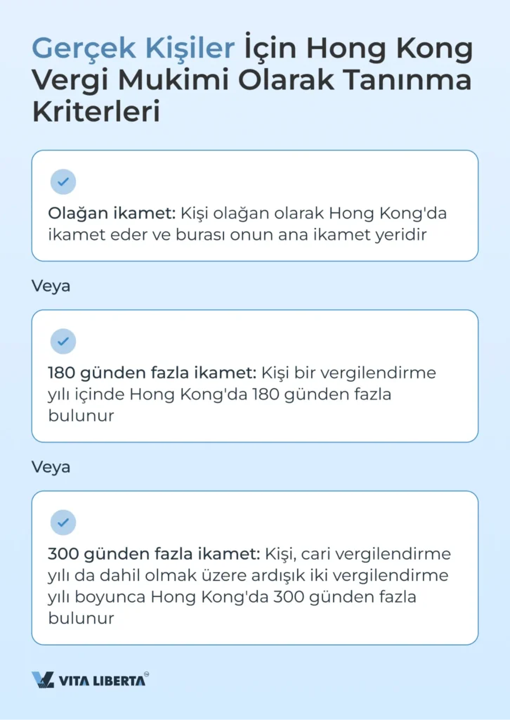 Gerçek kişiler için: Hong Kong’da olağan ikamet, yılda 180 günden fazla ikamet veya iki yılda 300 günden fazla ikamet şartlarından birinin karşılanması gereklidir. Tüzel kişiler için: Şirketin Hong Kong’da tescil edilmiş olması veya Hong Kong bölgesinden yönetiliyor ve kontrol ediliyor olması ger-eklidir.