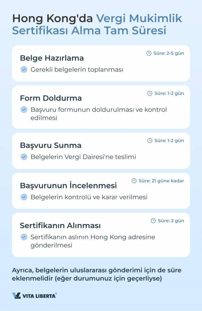 Başvuru sunulduktan sonra, Hong Kong Vergi Dairesi başvuruyu inceler ve gerekirse ek bilgi talep eder. Sağlanan bilgiler doğru ve gerekçelendirilmiş ise, vergi dairesi sertifikayı verir. Başvurunun incelenme süreci genellikle 21 iş gününe kadar sürer.