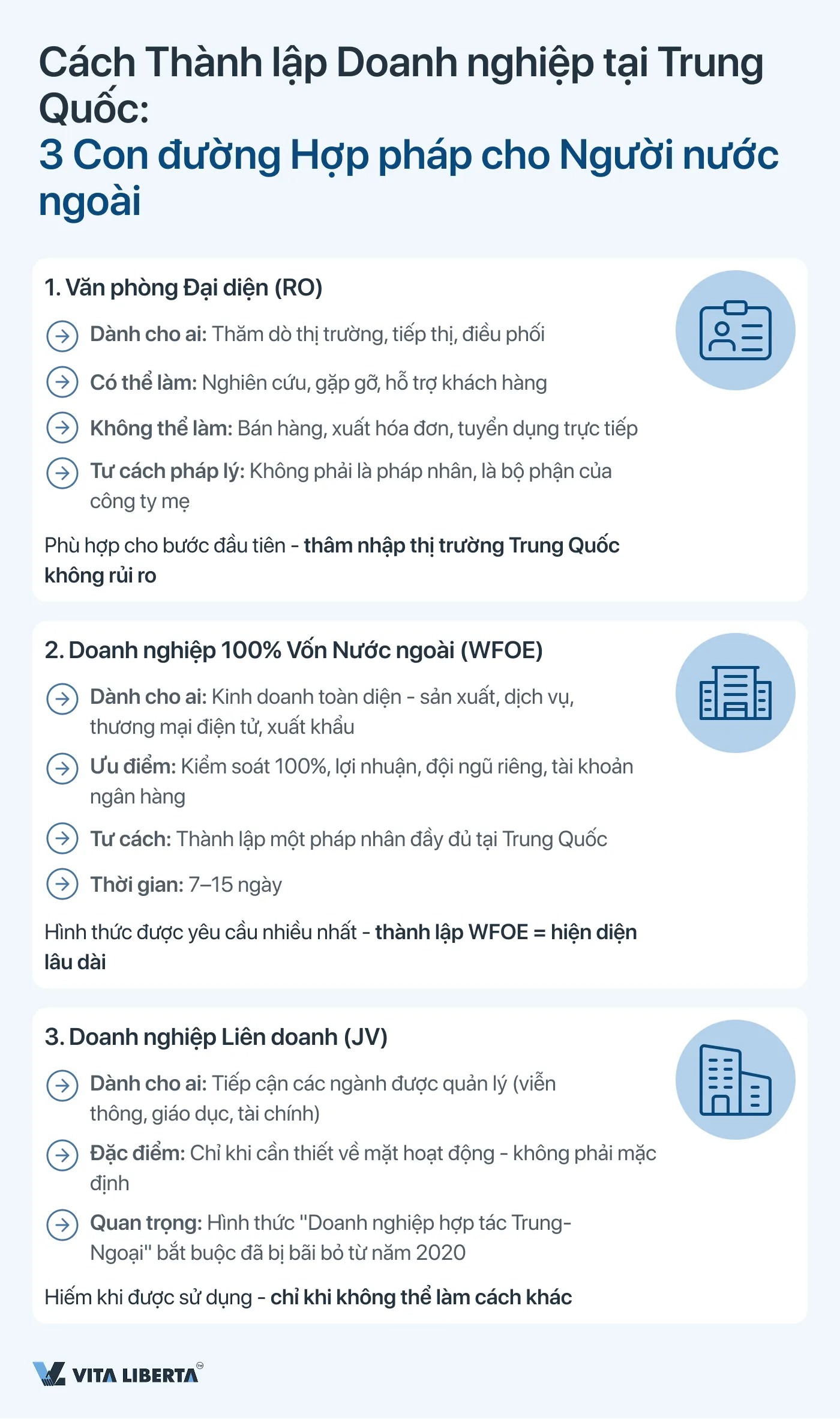 - Thành lập WFOE, liên doanh (JV), văn phòng đại diện (RO)