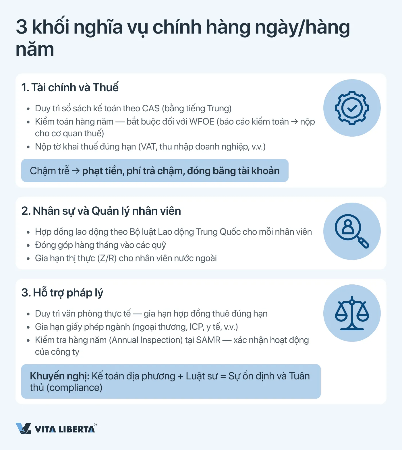 Kiểm tra hàng năm của công ty (Annual Inspection): Cung cấp dữ liệu cơ bản về công ty cho cơ quan SAMR để xác nhận tính liên tục của hoạt động.Quản lý có hệ thống các quy trình này, thường với sự tham gia của kế toán và luật sư địa phương, là chìa khóa cho hoạt động lâu dài và không bị gián đoạn của doanh nghiệp trên thị trường Trung Quốc.