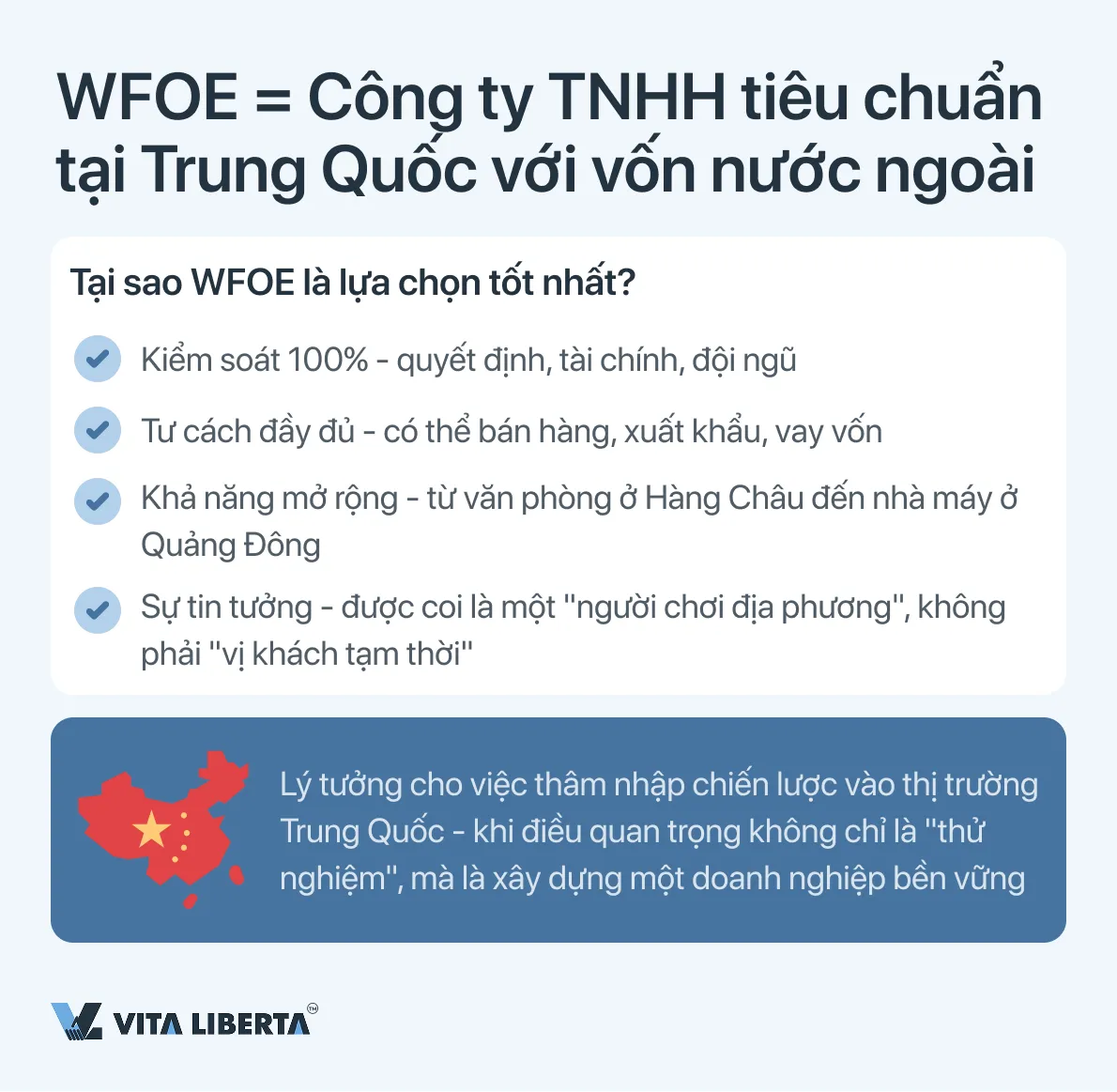 Để điều hành kinh doanh độc lập, lâu dài với quyền bán hàng, tuyển dụng nhân viên và thu lợi nhuận, lựa chọn tối ưu là Doanh nghiệp 100% vốn nước ngoài (WFOE). Đây là một pháp nhân Trung Quốc đầy đủ với 100% vốn nước ngoài, mang lại toàn quyền kiểm soát doanh nghiệp. Văn phòng đại diện (RO) không được phép tiến hành hoạt động thương mại, còn doanh nghiệp liên doanh (JV) ngày nay chủ yếu được sử dụng để tiếp cận các ngành được quy định bởi luật (ví dụ: viễn thông hoặc giáo dục).