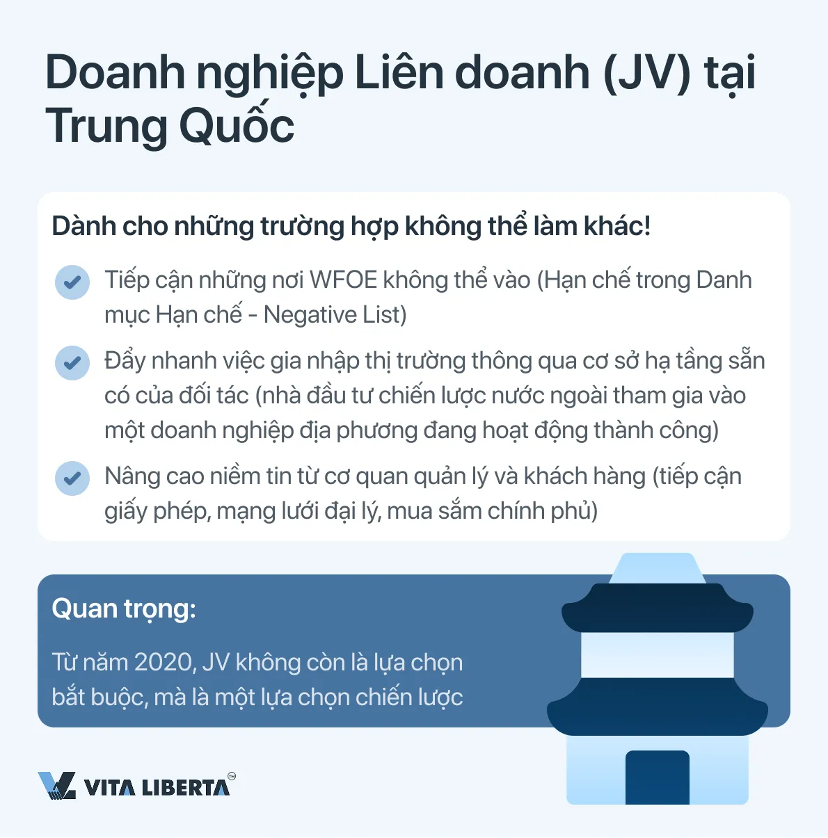 Mặc dù Luật Đầu tư Nước ngoài (2020) đã bãi bỏ việc bắt buộc thành lập JV trong hầu hết các ngành, nó vẫn là công cụ chủ chốt trong các phân khúc được đưa vào Biện pháp Quản lý Đặc biệt (Danh mục Hạn chế – Negative List), do Bộ Thương mại (MOFCOM) và Ủy ban Cải cách và Phát triển Quốc gia (NDRC) phê duyệt (bản sửa đổi 2025).