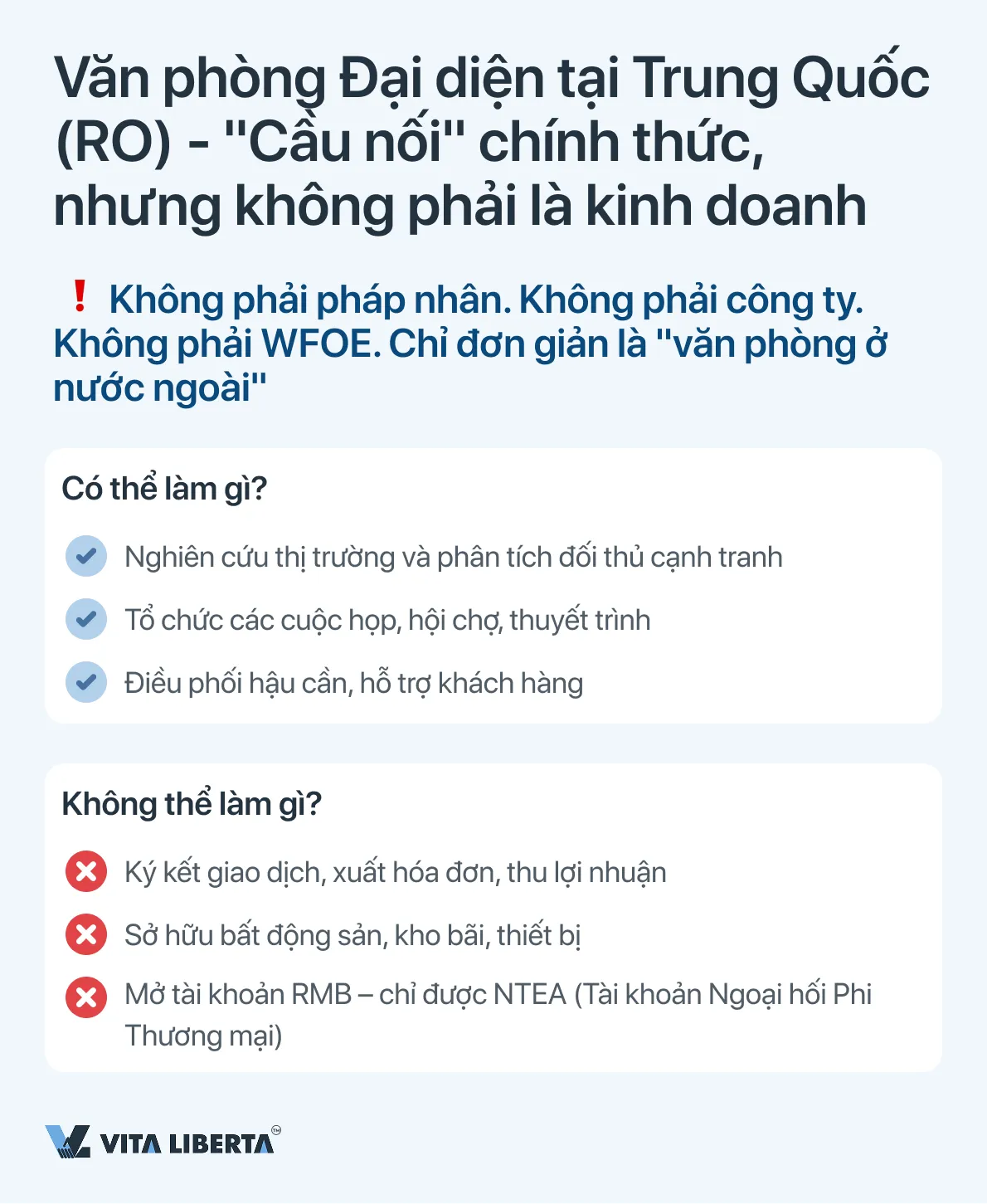 - Văn phòng Đại diện (RO): Chỉ phù hợp cho hoạt động tiếp thị, nghiên cứu và điều phối hậu cần. Hoạt động thương mại trực tiếp bị cấm (Điểm 5, Quy định về Văn phòng Đại diện của Doanh nghiệp Nước ngoài, SAMR, 2023).