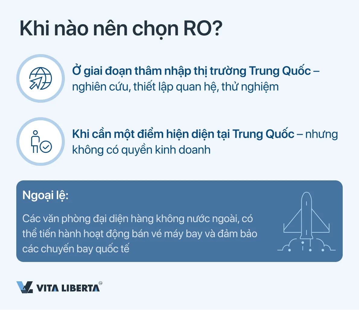 Do đó, RO không phải là đăng ký một công ty tại Trung Quốc, mà là một công cụ tạm thời để chuẩn bị cho việc đó. Lý tưởng cho những người mới bắt đầu thành lập doanh nghiệp tại Trung Quốc và muốn tránh rủi ro từ các hoạt động thương mại sớm.