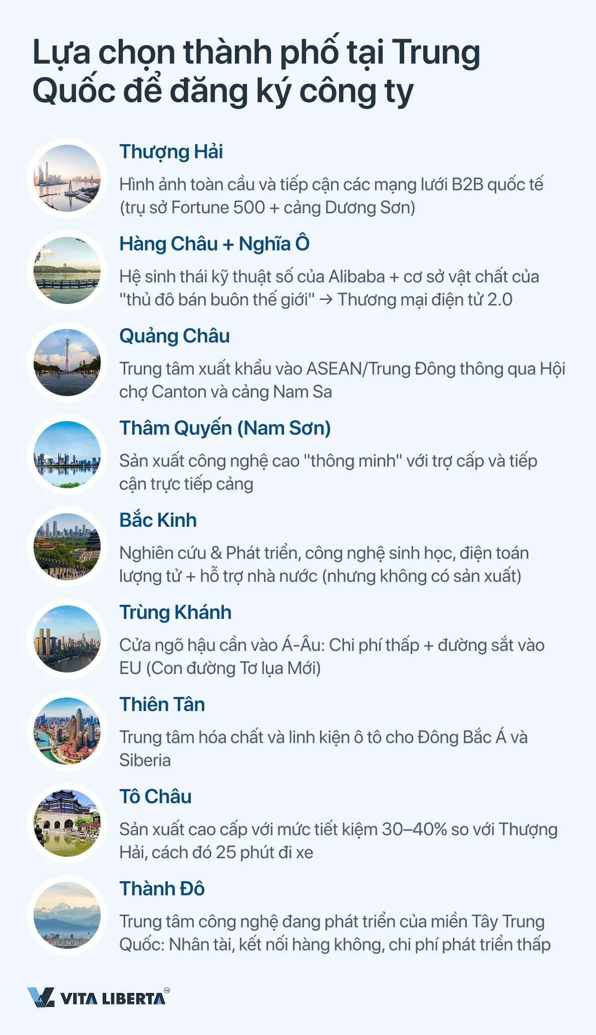 - Hàng Châu:Lý tưởng cho các dự án kỹ thuật số (SaaS, AI, thương mại điện tử) và thương mại bán buôn nhờ hệ sinh thái Alibaba và gần “thủ đô bán buôn thế giới” Nghĩa Ô (Yiwu).
