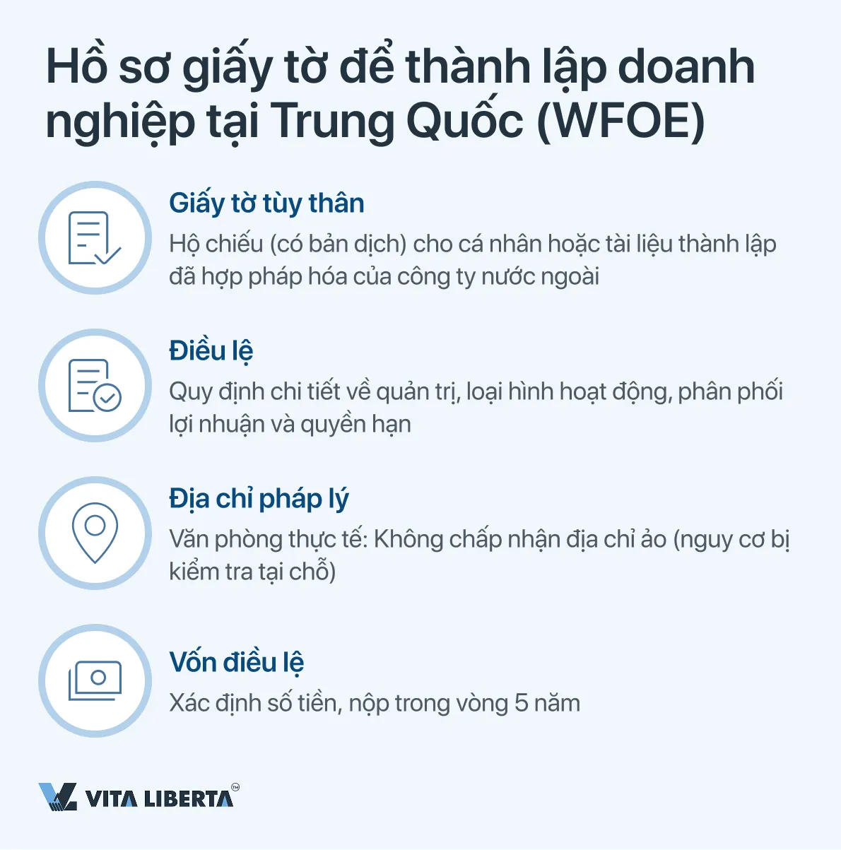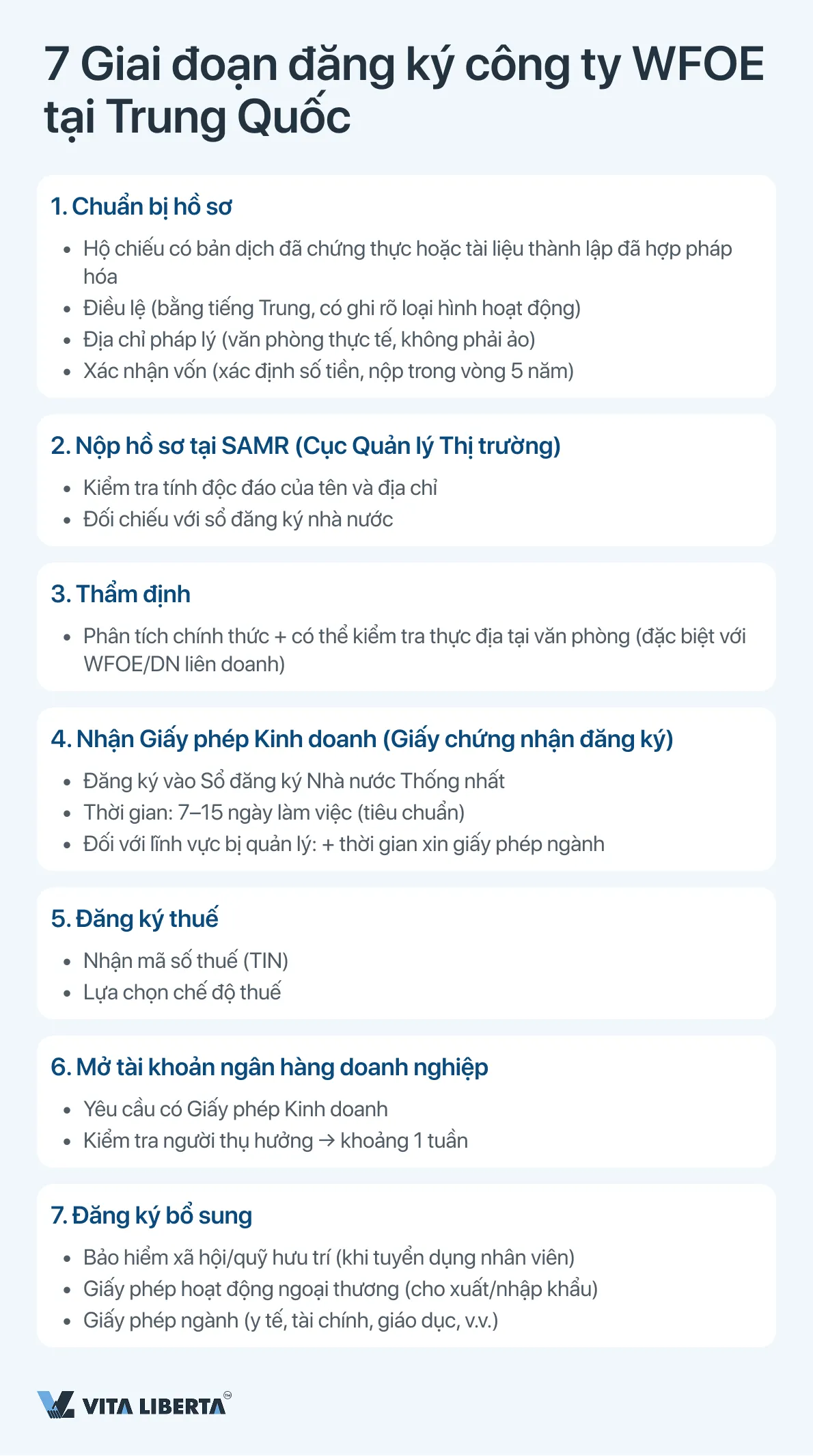 Quan trọng: Kể từ năm 2020, Giấy chứng nhận Phê duyệt (Approval Certificate) đã bị bãi bỏ – thay vào đó, chỉ cần có bản ghi trong Hệ thống Thông tin Công khai Quốc gia về Doanh nghiệp (www.gsxt.gov.cn) là đủ. WFOE không phải là một “chế độ đặc biệt”, mà là một công ty TNHH tiêu chuẩn với vốn nước ngoài.