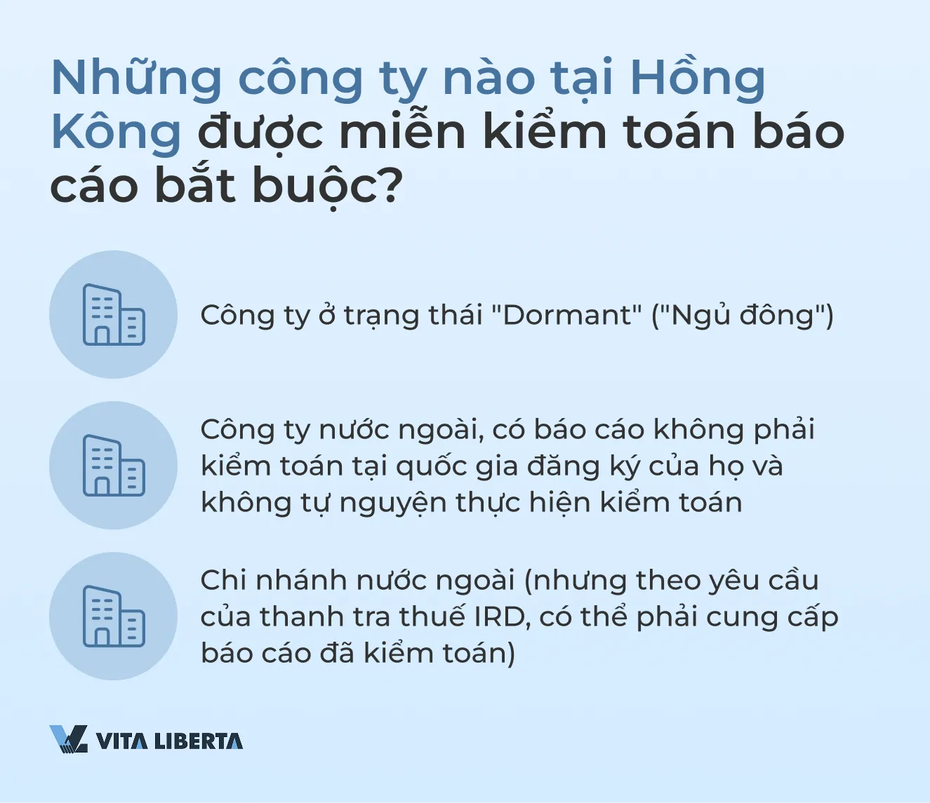 | Đối tượng được miễn | Công ty “Ngủ đông” (Dormant) | Công ty “Ngủ đông” (Dormant);Các công ty đăng ký tại các quốc gia không yêu cầu kiểm toán báo cáo bắt buộc và không tự nguyện thực hiện kiểm toán;Chi nhánh của các công ty nước ngoài tại Hồng Kông (có thể được yêu cầu nếu cần thiết bởi thanh tra thuế). |