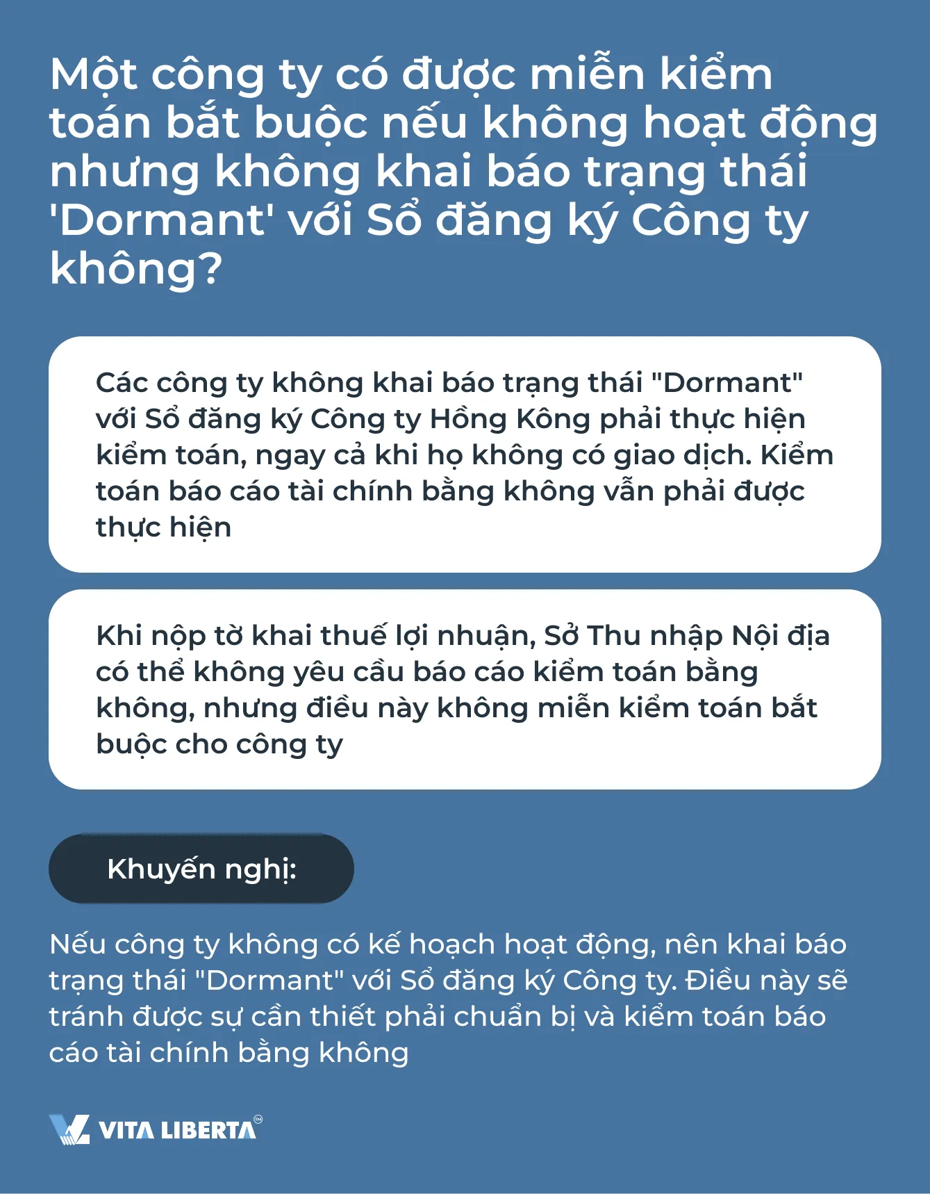 Điều quan trọng cần hiểu là một công ty “ngủ đông” khác với một công ty tạm thời không hoạt động. Trạng thái công ty “ngủ đông” được thiết lập chính thức trong nội bộ công ty và được công bố chính thức tại Sổ đăng ký Công ty theo Mục 447 Chương 622 của Pháp lệnh Công ty Hồng Kông. Chỉ trong trường hợp này công ty mới có thể yêu cầu sự nới lỏng quy định về việc kiểm toán báo cáo bắt buộc. Trong khi đó, một công ty không hoạt động vẫn phải tuân thủ tất cả các yêu cầu pháp lý không có ngoại lệ.