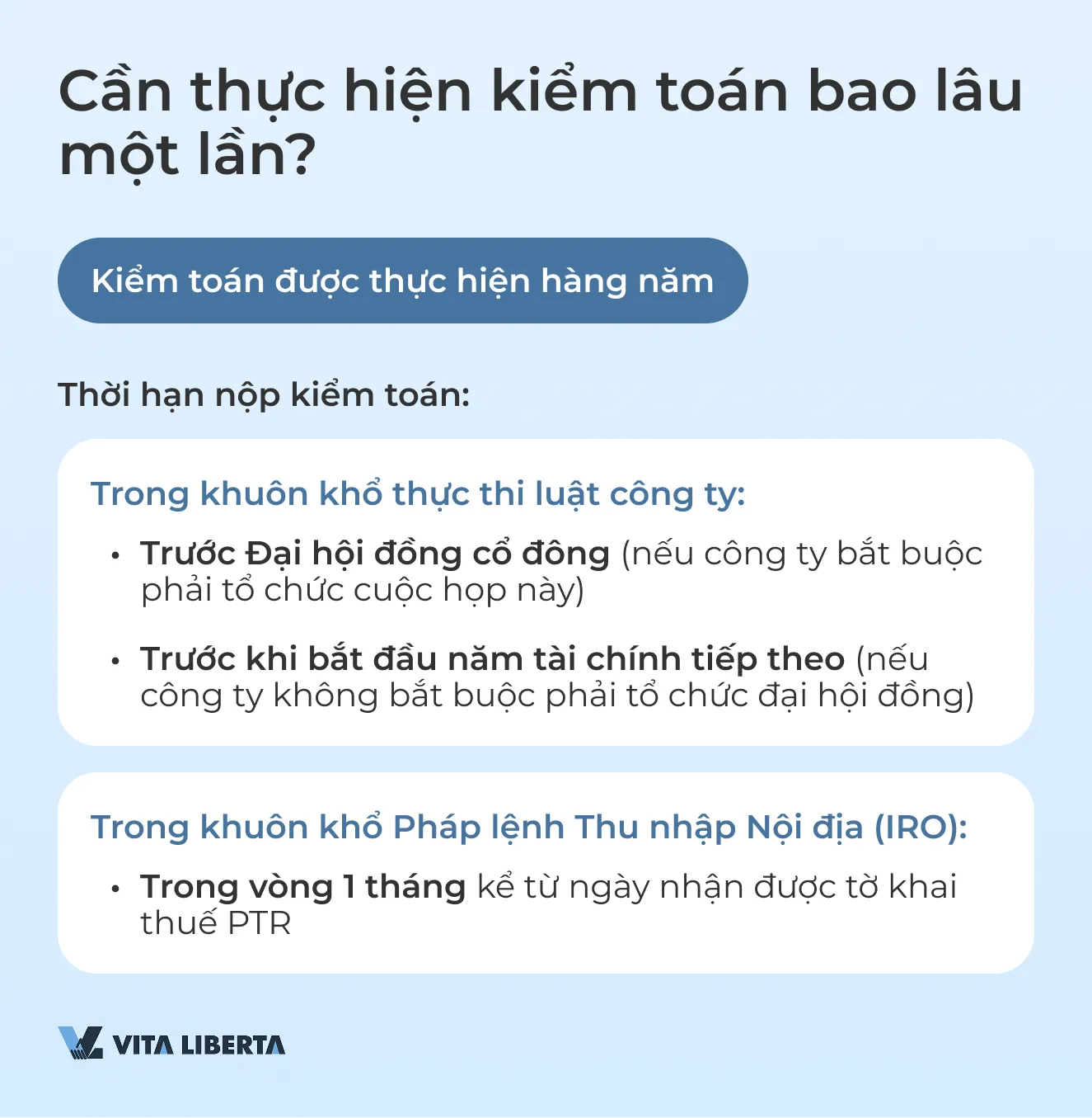 | Thời hạn chuẩn bị và cung cấp | Trong vòng 9 tháng sau khi kết thúc năm tài chính. Khi thay đổi kiểm toán viên, kiểm toán viên mới phải được bổ nhiệm trong vòng 1 tháng. | Trong vòng 1 tháng kể từ khi nhận được PTR. Theo các điều kiện nhất định và theo yêu cầu, thời hạn có thể được gia hạn. |