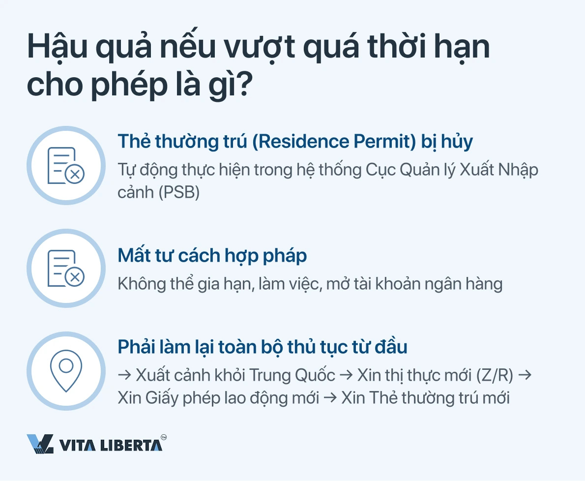 Trả lời: Nếu bạn liên tục ở ngoài lãnh thổ Trung Quốc hơn 183 ngày, Thẻ thường trú (Residence Permit) của bạn sẽ bị hủy bỏ tự động bởi hệ thống quản lý của cơ quan di trú (PSB), ngay cả khi thẻ vẫn còn thời hạn. Để khôi phục tư cách, bạn sẽ phải làm lại thủ tục xin thị thực lao động và Thẻ thường trú từ đầu.