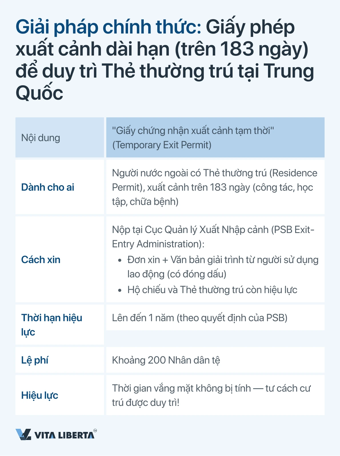 Giải pháp: Hoặc là theo dõi chặt chẽ thời gian vắng mặt và trở về trước 183 ngày, hoặc là làm thủ tục trước tại PSB để xin “Giấy chứng nhận xuất cảnh tạm thời” (Temporary Exit Permit), loại giấy tờ này sẽ “đóng băng” bộ đếm thời gian đó trong thời hạn lên đến 1 năm.