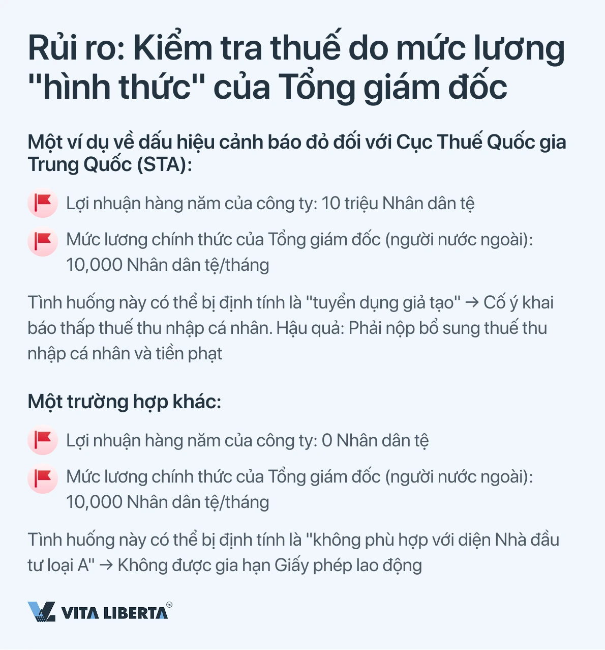 Trong khuôn khổ giám sát thuế đối với hoạt động của các công ty có vốn đầu tư nước ngoài, cơ quan thuế Trung Quốc đặc biệt chú trọng phân tích sự phù hợp giữa các điều kiện trong hợp đồng lao động của các nhà quản lý cấp cao (đặc biệt là tổng giám đốc sáng lập) với thực tế kinh tế và tiêu chuẩn thị trường. Trường hợp mức lương chính thức của người đại diện pháp luật duy nhất của công ty chỉ ở mức, ví dụ, 10.000 nhân dân tệ một tháng, trong khi lợi nhuận ròng hàng năm của pháp nhân đạt 10 triệu nhân dân tệ, sẽ rất có thể bị coi là một kế hoạch có dấu hiệu “tuyển dụng giả tạo”.