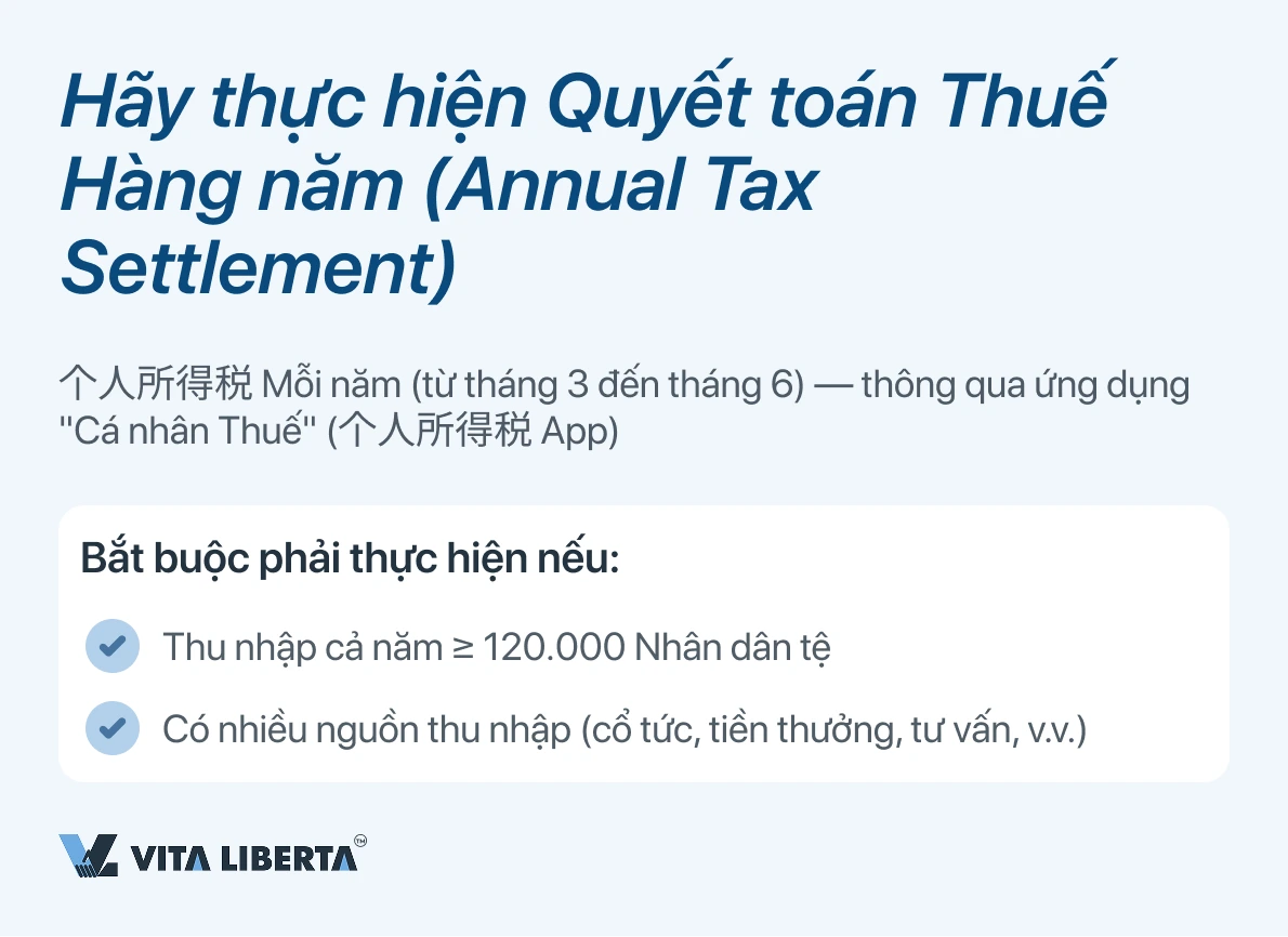 Vào cuối mỗi năm dương lịch, Tổng giám đốc (cũng như bất kỳ cá nhân cư trú nào có thu nhập từ nhiều nguồn hoặc tổng thu nhập hàng năm trên 120.000 Nhân dân tệ) phải thực hiện thủ tục quyết toán thuế cuối năm (Annual Tax Settlement) thông qua nền tảng “个人所得税” (Ứng dụng Thuế thu nhập cá nhân).