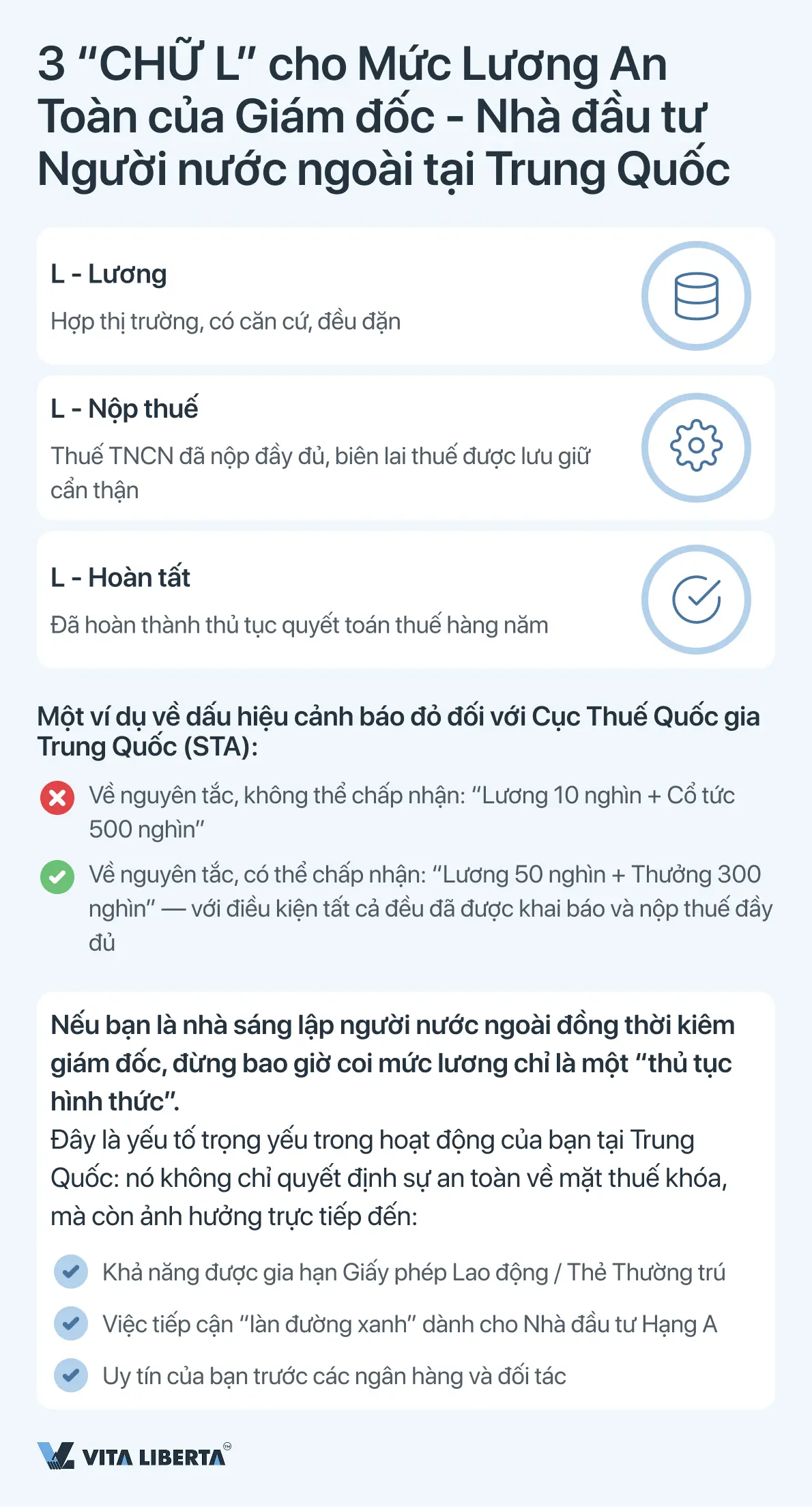 Đối với một nhà đầu tư kiêm giám đốc người nước ngoài, việc coi mức lương chính thức của mình chỉ là một khoản chi phí kỹ thuật là điều không thể chấp nhận được. Mức lương đó phải có cơ sở kinh tế hợp lý, và tất cả các nghĩa vụ thuế liên quan phải được thực hiện một cách có hệ thống và minh bạch. Cách tiếp cận này không chỉ loại bỏ rủi ro phải nộp bổ sung thuế và tiền phạt, mà còn xây dựng danh tiếng kinh doanh hoàn hảo cho công ty trong mắt các cơ quan quản lý Trung Quốc.