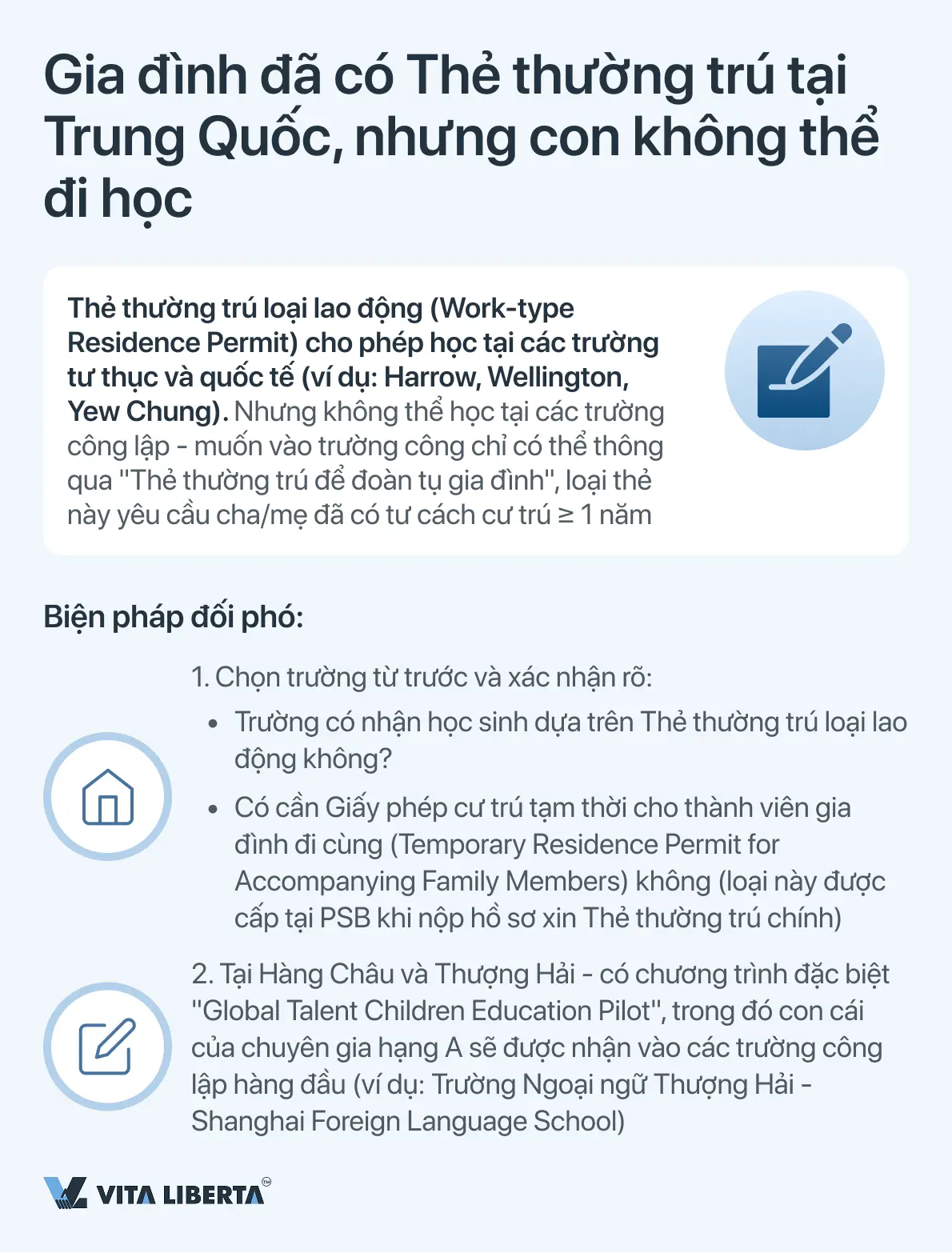 Việc chuyên gia nước ngoài nhận được Thẻ thường trú loại lao động (Work-type Residence Permit) và làm thủ tục cấp thẻ thường trú tương tự cho các thành viên gia đình (Family Member Residence Permit) trên cơ sở đó không đảm bảo quyền tiếp cận tự động vào hệ thống giáo dục phổ thông công lập của Trung Quốc cho con cái. Loại thẻ thường trú này được thiết kế chủ yếu để hợp pháp hóa việc cư trú liên quan đến hoạt động lao động của người nộp đơn chính.