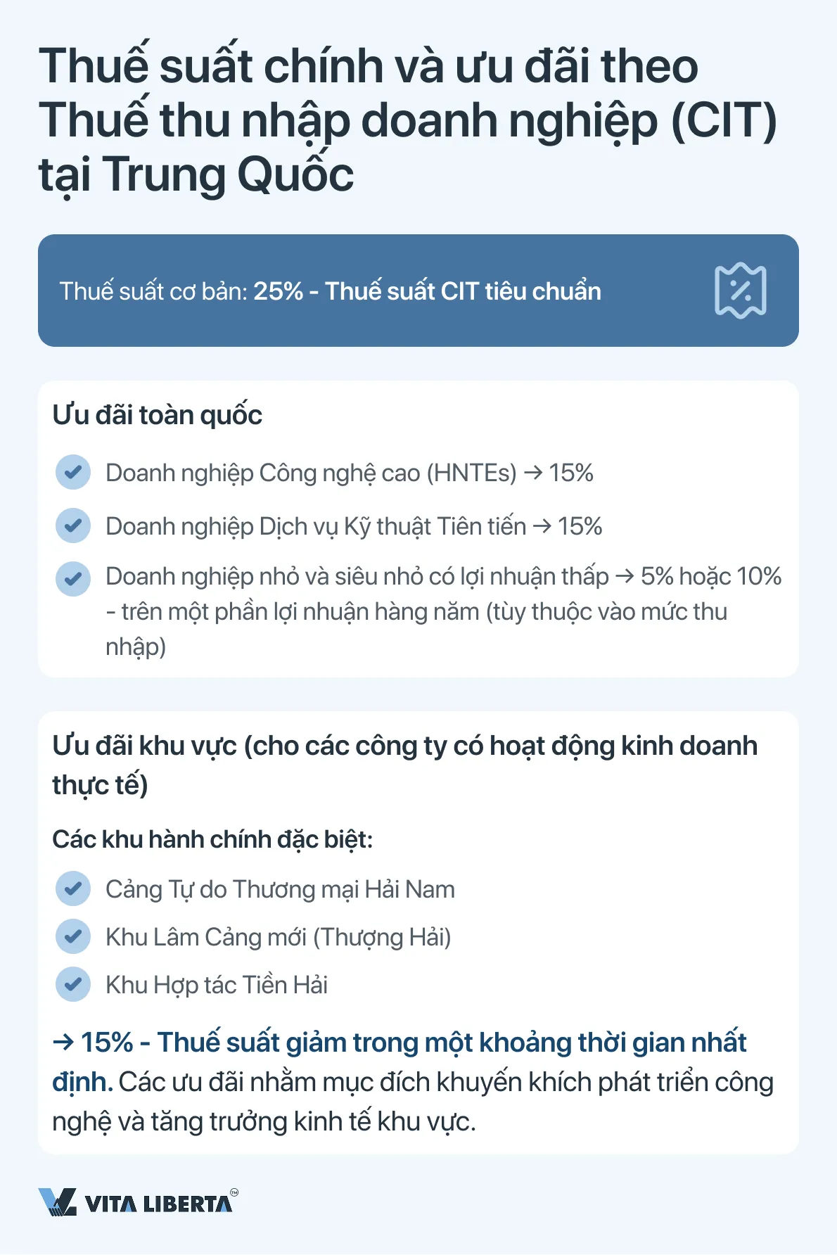 Ưu đãi khu vực: Các khu hành chính đặc biệt (ví dụ: Cảng Tự do Thương mại Hải Nam, Khu Lâm Cảng mới ở Thượng Hải, Khu Hợp tác Tiền Hải) cung cấp mức thuế suất 15% trong một khoảng thời gian nhất định cho các công ty khuyến khích có hoạt động kinh doanh thực tế (operational substance).