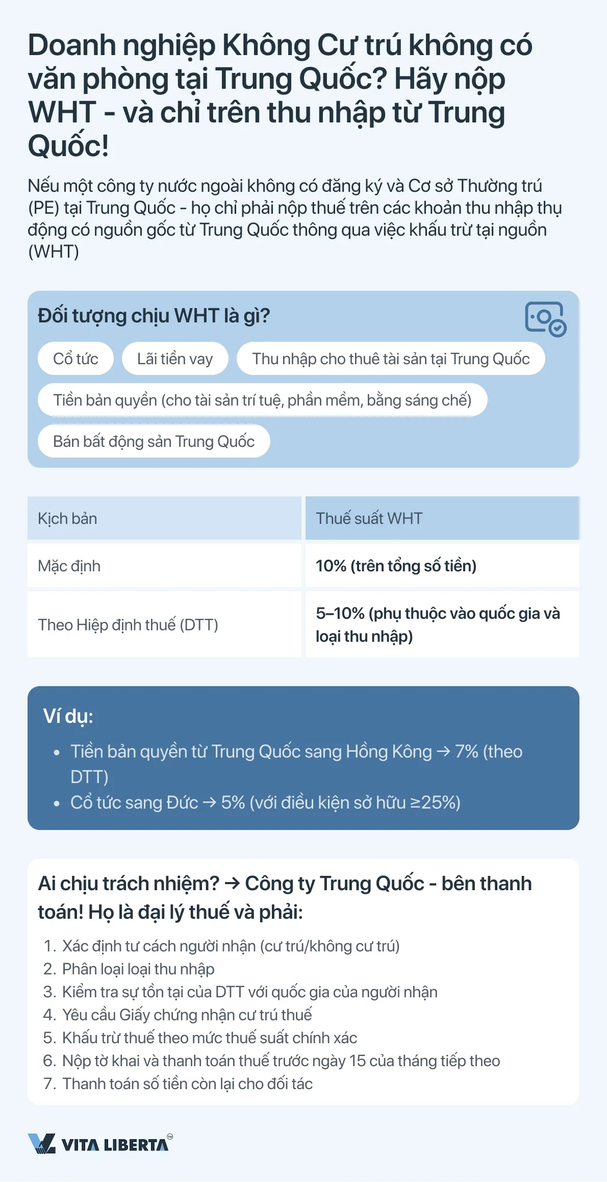 - Vai trò và trách nhiệm của đại lý: Công ty Trung Quốc là bên thanh toán, thực hiện thanh toán cho doanh nghiệp không cư trú, được coi là đại lý thuế (withholding agent). Họ chịu trách nhiệm pháp lý và tài chính đầy đủ về việc: