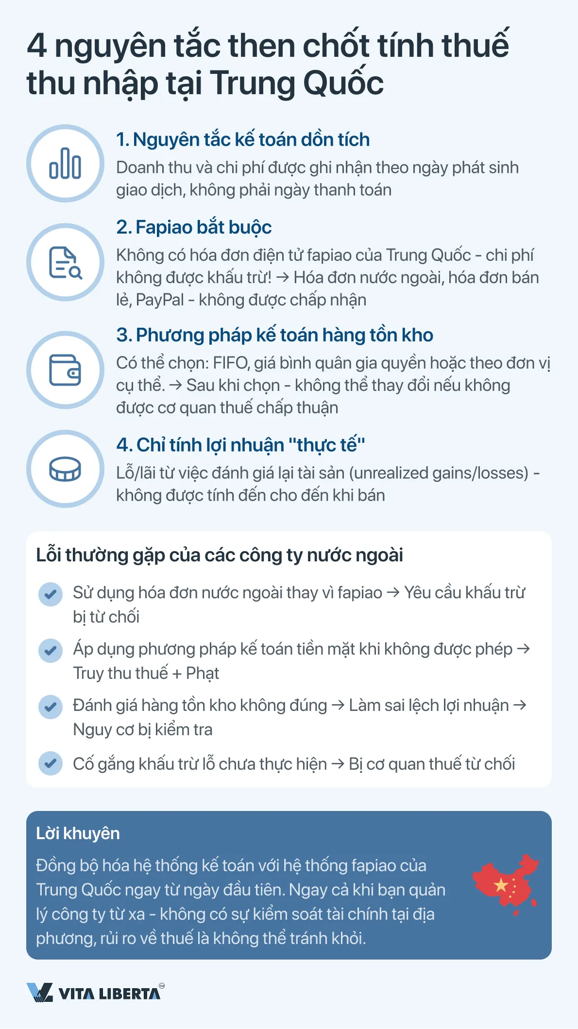 Bắt buộc fapiao: Bất kỳ chi phí nào được yêu cầu để giảm cơ sở tính thuế đều phải được chứng minh bằng hóa đơn thuế điện tử chính thức của Trung Quốc (fapiao). Hóa đơn bán lẻ, hóa đơn nước ngoài, thanh toán qua PayPal, v.v… không được cơ quan thuế chấp nhận làm cơ sở để khấu trừ. Việc thiếu hóa đơn fapiao đúng quy định khiến chi phí không được khấu trừ.