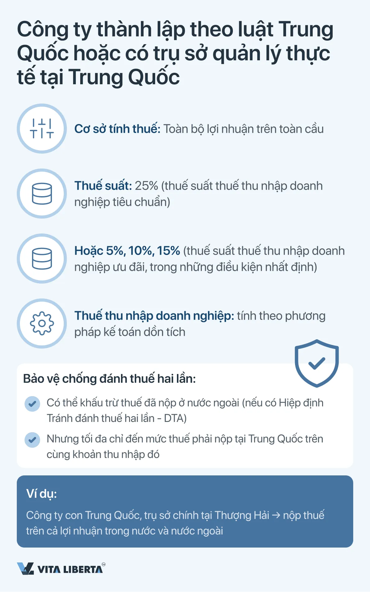 Doanh nghiệp Cư trú Thuế (Tax Resident Enterprise, TRE): Nhóm này bao gồm các công ty được thành lập theo luật Trung Quốc, hoặc có trụ sở quản lý thực tế tại Trung Quốc. TRE tuân theo nguyên tắc đánh thuế toàn cầu. Điều này có nghĩa họ phải kê khai và nộp thuế tại Trung Quốc trên toàn bộ lợi nhuận của mình, cả trong nước lẫn nước ngoài. Để tránh đánh thuế hai lần đối với thu nhập nước ngoài, áp dụng cơ chế khấu trừ thuế đã nộp ở nước ngoài (với các giới hạn).