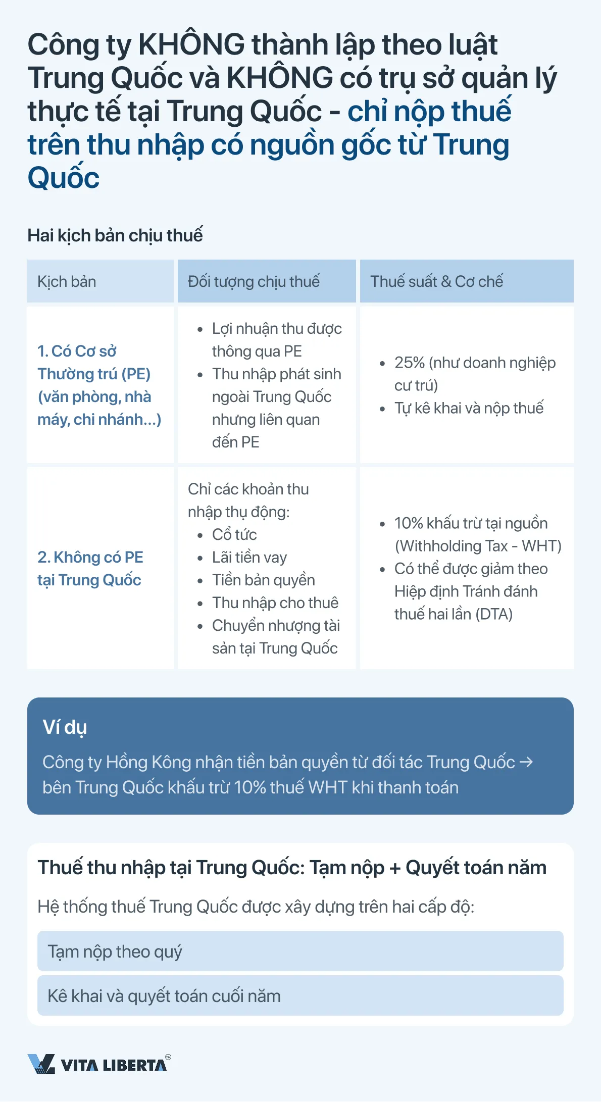 Đối với các công ty nước ngoài không phải là cư trú thuế Trung Quốc (non-TRE) và không có Cơ sở Thường trú (PE) tại Trung Quốc, áp dụng chế độ thuế đặc biệt đối với thu nhập có nguồn gốc từ Trung Quốc. Cơ chế chính là khấu trừ thuế tại nguồn (Withholding Tax – WHT).