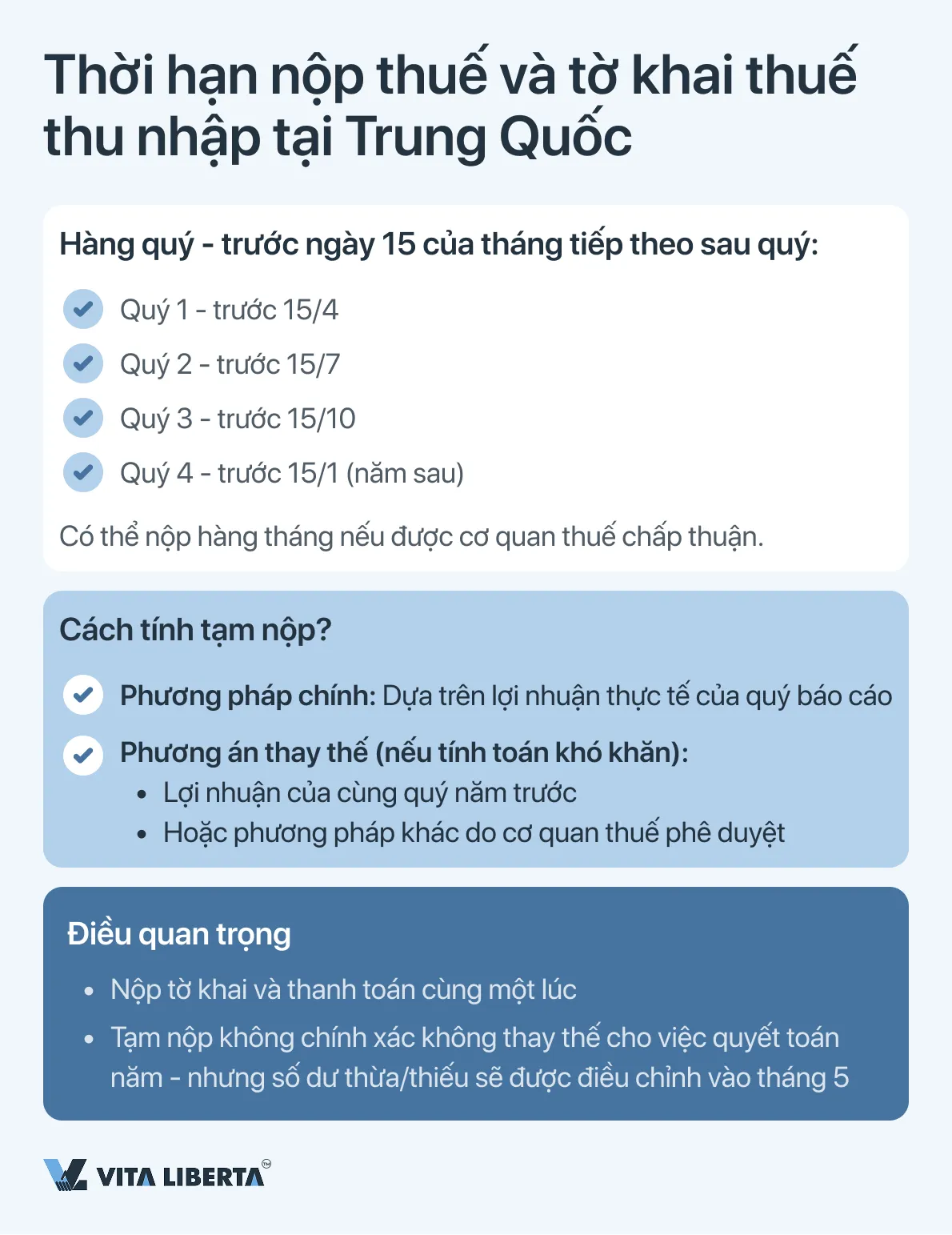 Cơ quan thuế Trung Quốc quản lý Thuế thu nhập doanh nghiệp (CIT) dựa trên nguyên tắc tạm nộp trước (tạm ứng) và quyết toán cuối năm. Hệ thống này đảm bảo dòng tiền vào ngân sách đều đặn và cho phép các công ty điều chỉnh nghĩa vụ thuế của mình dựa trên kết quả tài chính thực tế khi kết thúc kỳ báo cáo.