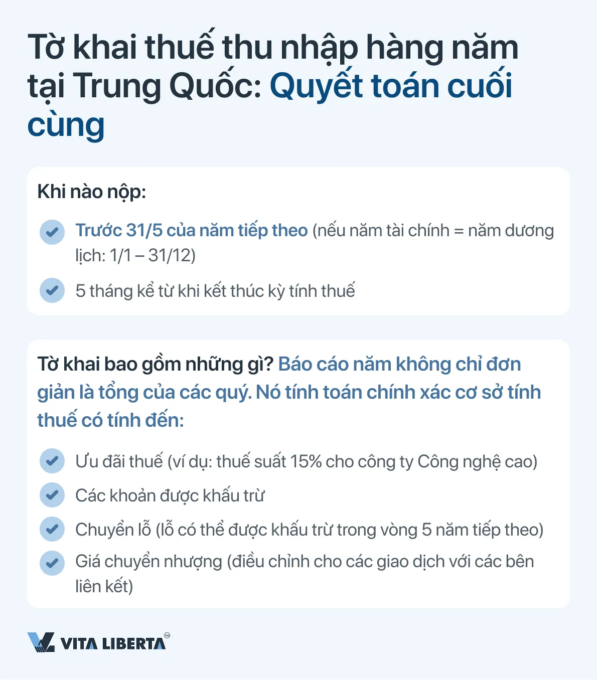 - Nội dung: Đây là giai đoạn then chốt, xác định cơ sở tính thuế cuối cùng có tính đến tất cả các ưu đãi (ví dụ: theo trạng thái HNTE), các khoản khấu trừ (bao gồm siêu khấu trừ R&D), chuyển lỗ (lên đến 5 năm) và các điều chỉnh. Tờ khai thường yêu cầu đính kèm báo cáo kiểm toán từ một công ty kiểm toán có giấy phép của Trung Quốc.