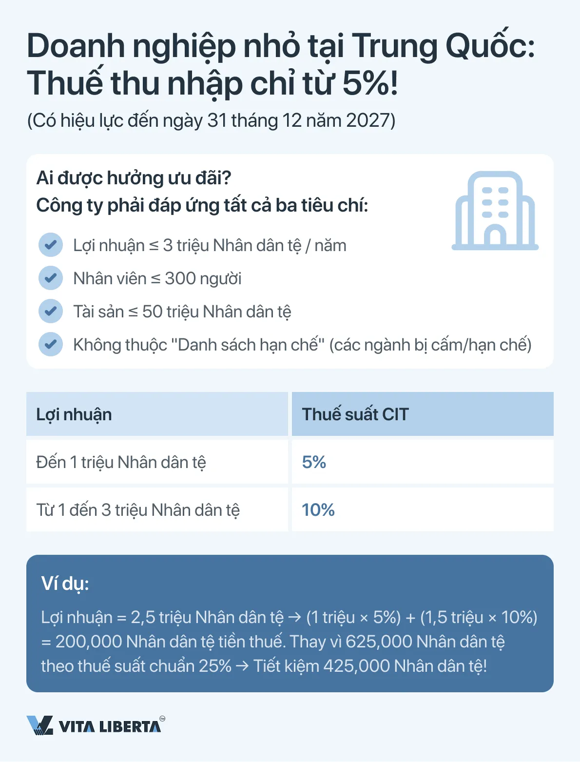 | Lợi nhuận chịu thuế hàng năm | ≤ 3 triệu Nhân dân tệ (CNY) | Tính cho năm thuế. |