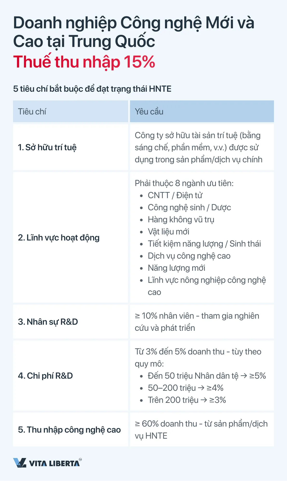 Công ty phải đáp ứng một loạt các tiêu chí nghiêm ngặt, bao gồm sở hữu tài sản trí tuệ cốt lõi, hoạt động trong ngành công nghệ cao ưu tiên, có tỷ lệ nhân viên R&D nhất định (≥10%), mức chi cho R&D trên doanh thu (từ 3% đến 5%) và tỷ lệ thu nhập công nghệ cao (≥60%).