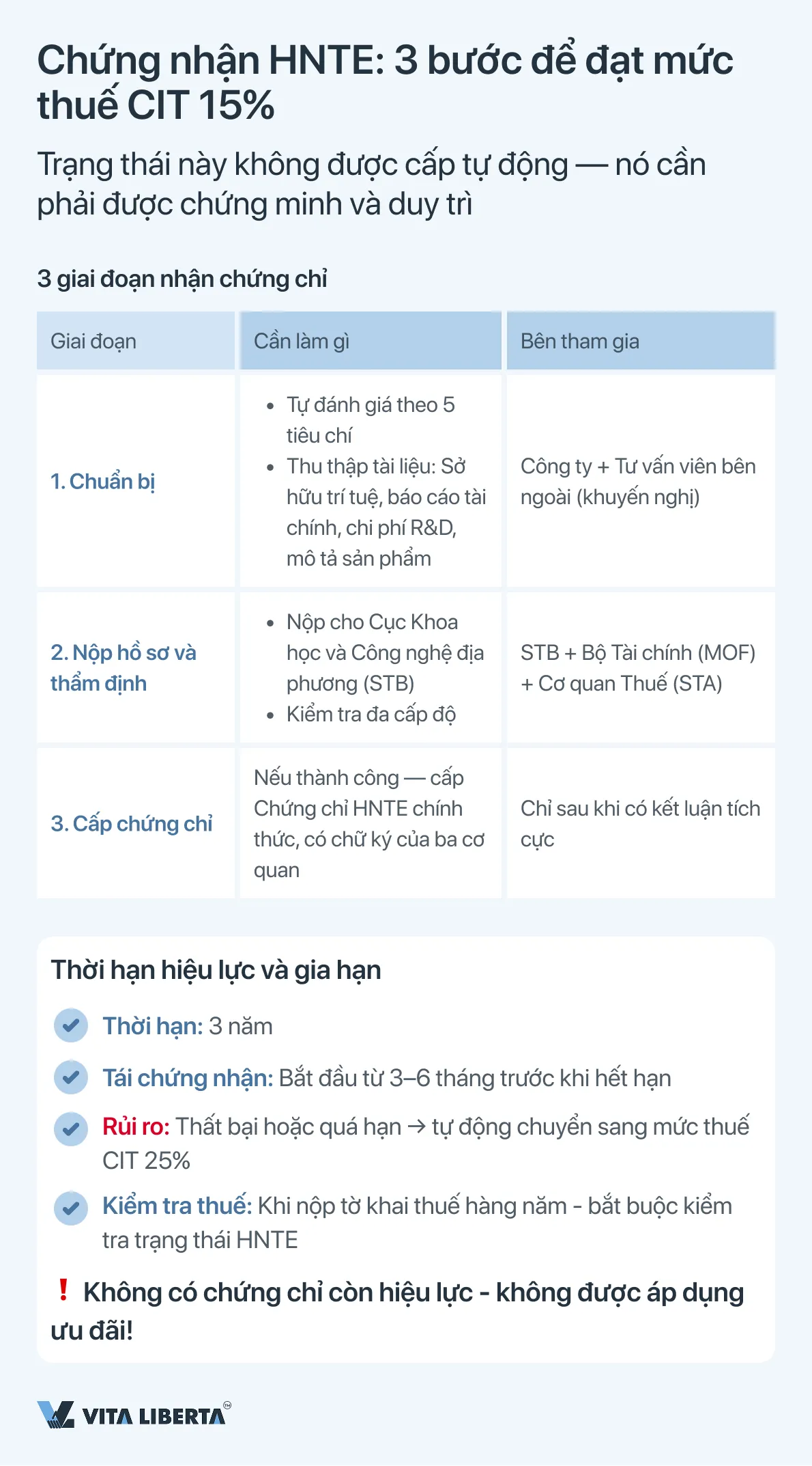 - 3-6 tháng trước khi chứng chỉ hết hạn, công ty phải chủ động thực hiện và vượt qua thủ tục tái chứng nhận (đánh giá lại), có độ phức tạp tương tự như đánh giá lần đầu. Việc bỏ lỡ thời hạn hoặc thất bại trong tái chứng nhận sẽ dẫn đến mất trạng thái và tự động chuyển sang mức thuế suất CIT chuẩn là 25%.