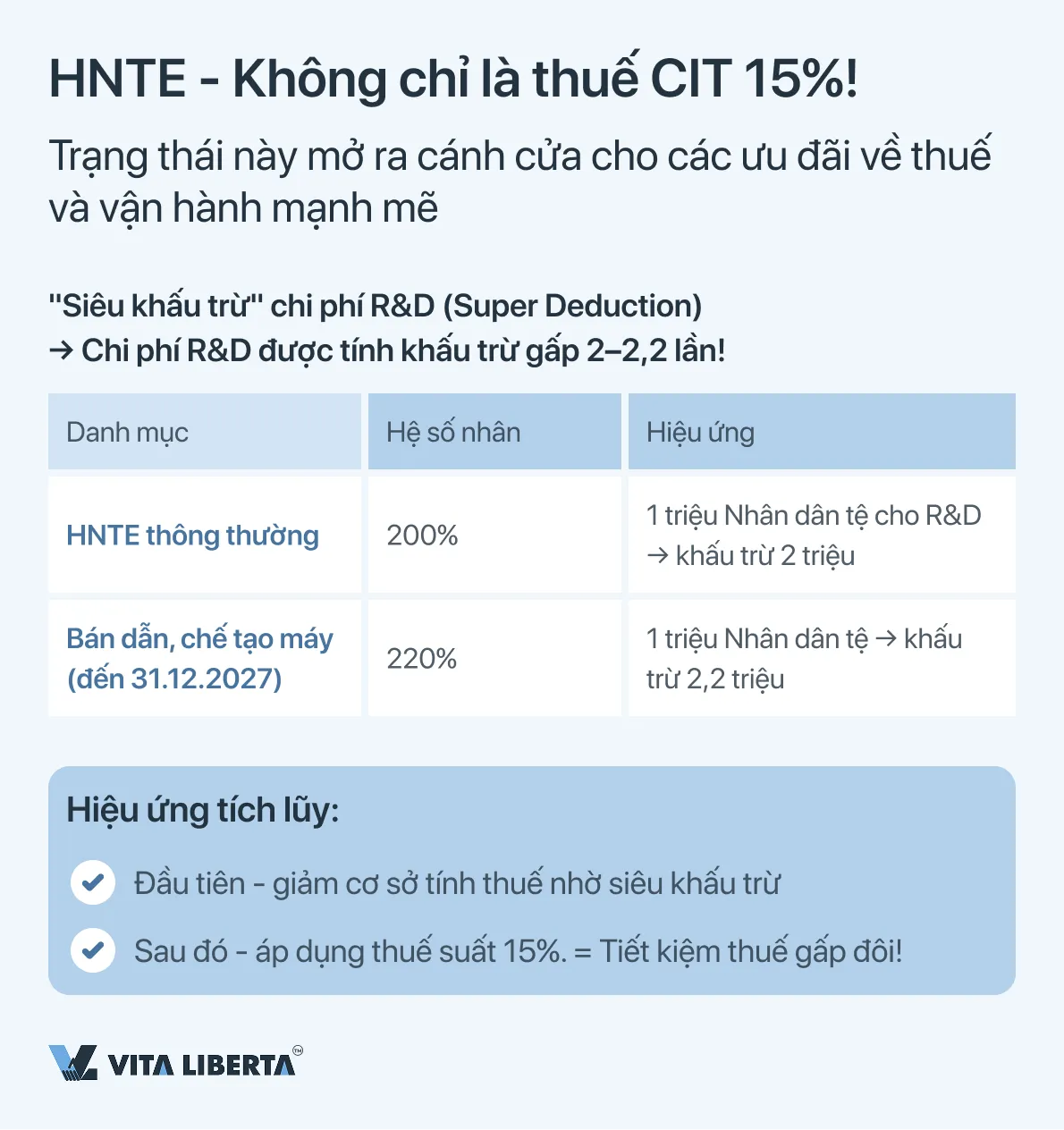 • Đối với hầu hết HNTE: Chi phí R&D thực tế có thể được khấu trừ ở mức 200% (tức là thêm 100% ngoài chi phí đã bỏ ra).