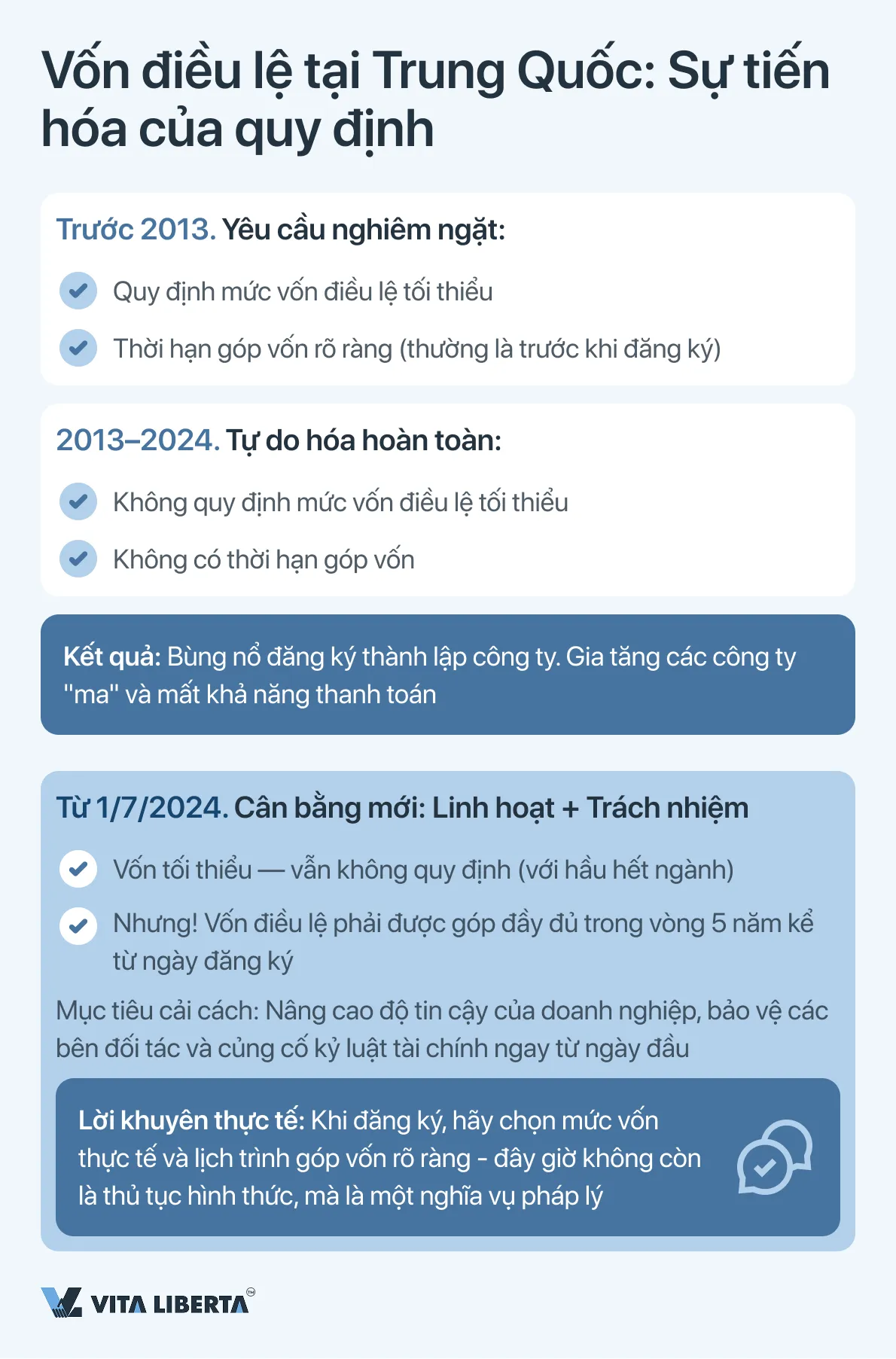 Trước năm 2013, Trung Quốc áp dụng một hệ thống buộc các thành viên sáng lập phải góp vốn điều lệ trong các thời hạn nghiêm ngặt và với các ngưỡng tối thiểu. Cuộc cải cách tự do hóa năm 2013 đã bãi bỏ cả thời hạn lẫn số tiền tối thiểu đối với hầu hết các ngành, chuyển quá trình này sang cho các cổ đông tự quyết định. Điều này dẫn đến sự bùng nổ đăng ký thành lập công ty, nhưng cũng làm nảy sinh rủi ro liên quan đến các công ty “ma”. Bản sửa đổi Luật Công ty của Trung Quốc, có hiệu lực từ ngày 1 tháng 7 năm 2024, đánh dấu sự trở lại của mô hình được quản lý, nhưng ở một định dạng cập nhật.