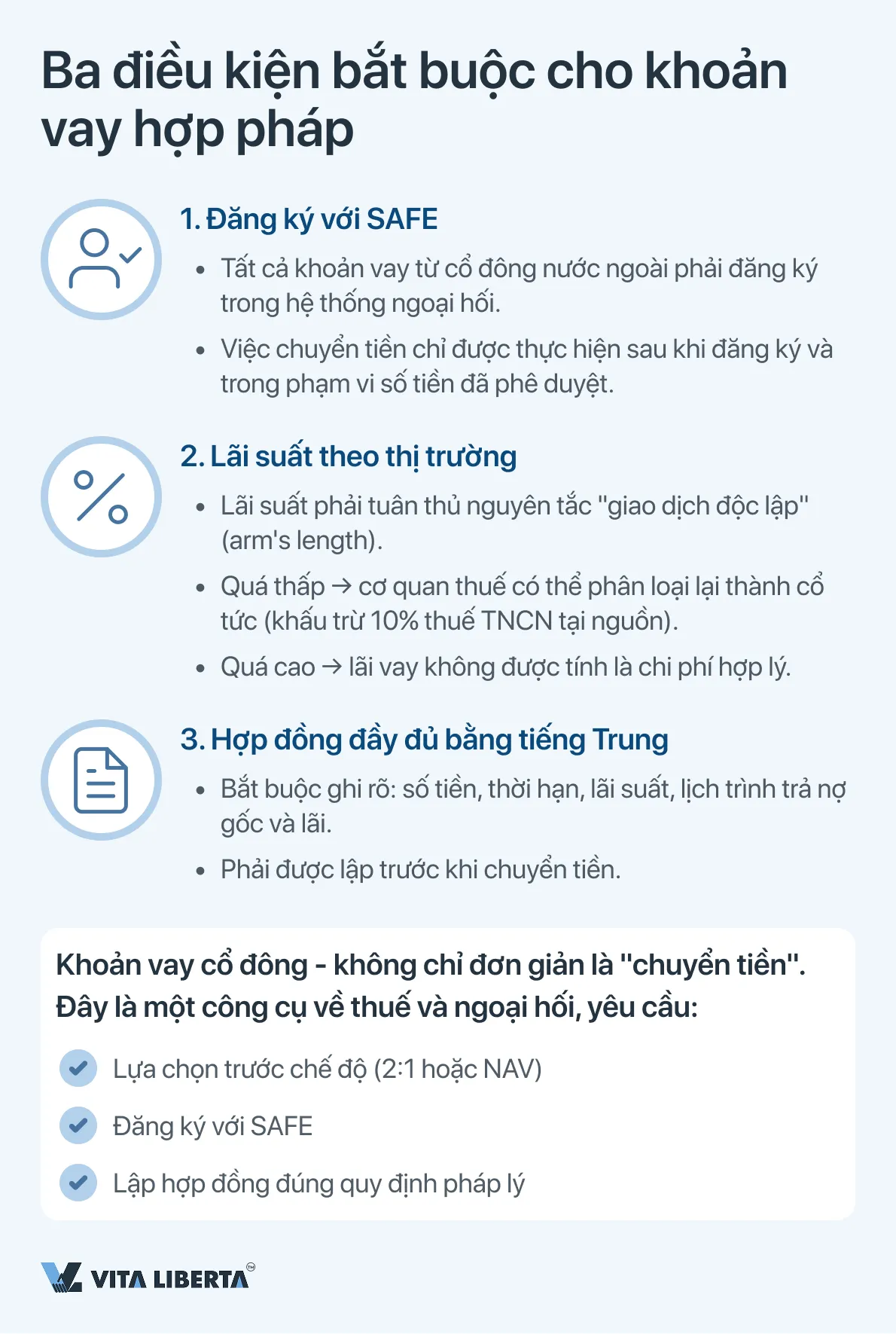 - Quản lý ngoại hối: Tất cả các khoản vay cổ đông từ nhà đầu tư nước ngoài phải được đăng ký trong hệ thống kiểm soát ngoại hối (SAFE). Việc chuyển tiền thực tế chỉ có thể thực hiện sau khi hoàn tất thủ tục đăng ký này và chính xác trong phạm vi số tiền đã đăng ký. Vi phạm quy trình này sẽ dẫn đến các khoản phạt nghiêm trọng và bị chặn giao dịch.