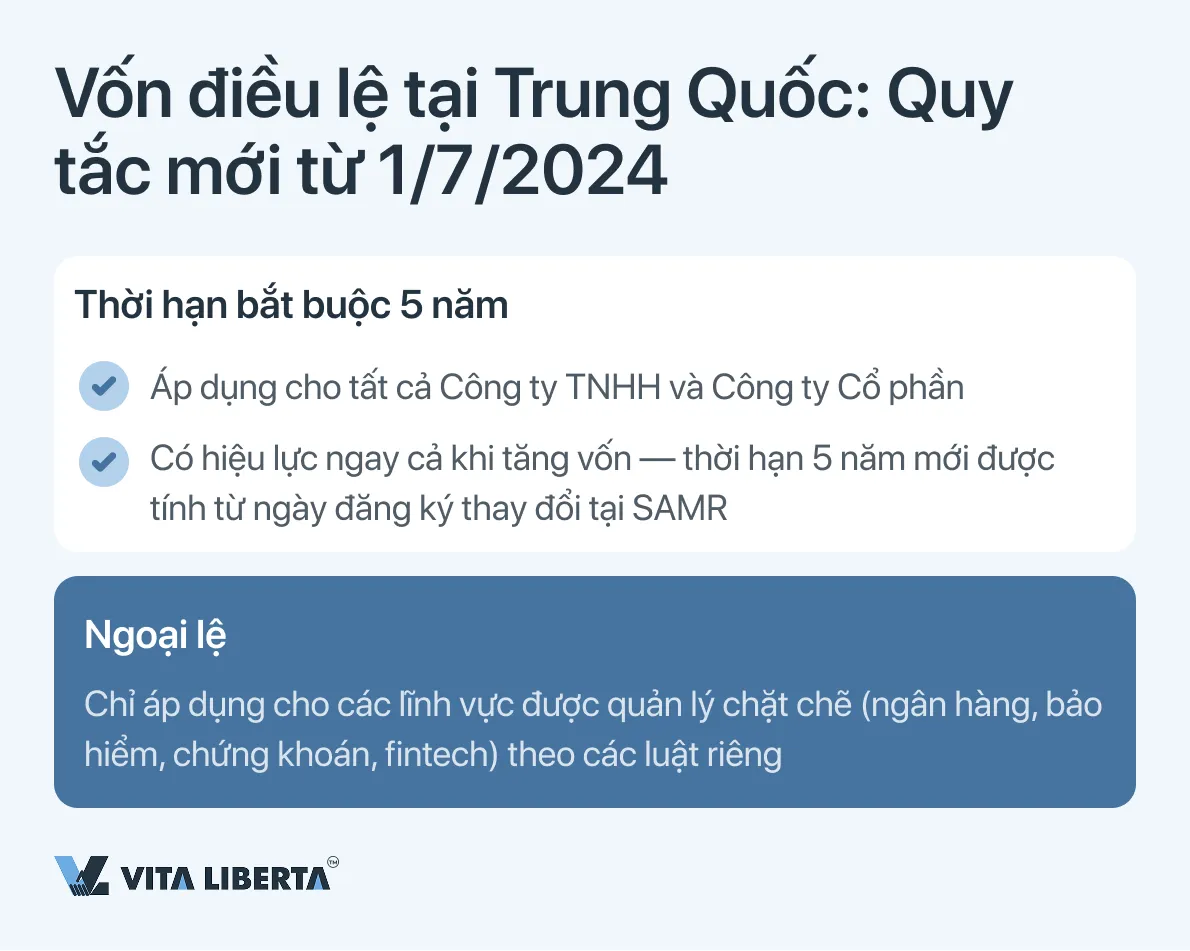 Theo bản sửa đổi mới của Luật Công ty Trung Quốc có hiệu lực từ ngày 1 tháng 7 năm 2024, các thành viên sáng lập có nghĩa vụ thanh toán đầy đủ vốn điều lệ đã đăng ký trong vòng 5 năm kể từ ngày đăng ký thành lập công ty với nhà nước. Quy tắc này là bắt buộc và nhằm tăng cường kỷ luật tài chính. Đối với các công ty đăng ký trước ngày này, áp dụng thời kỳ chuyển tiếp đến ngày 30 tháng 6 năm 2027 để điều chỉnh lịch trình góp vốn cho phù hợp với yêu cầu mới.