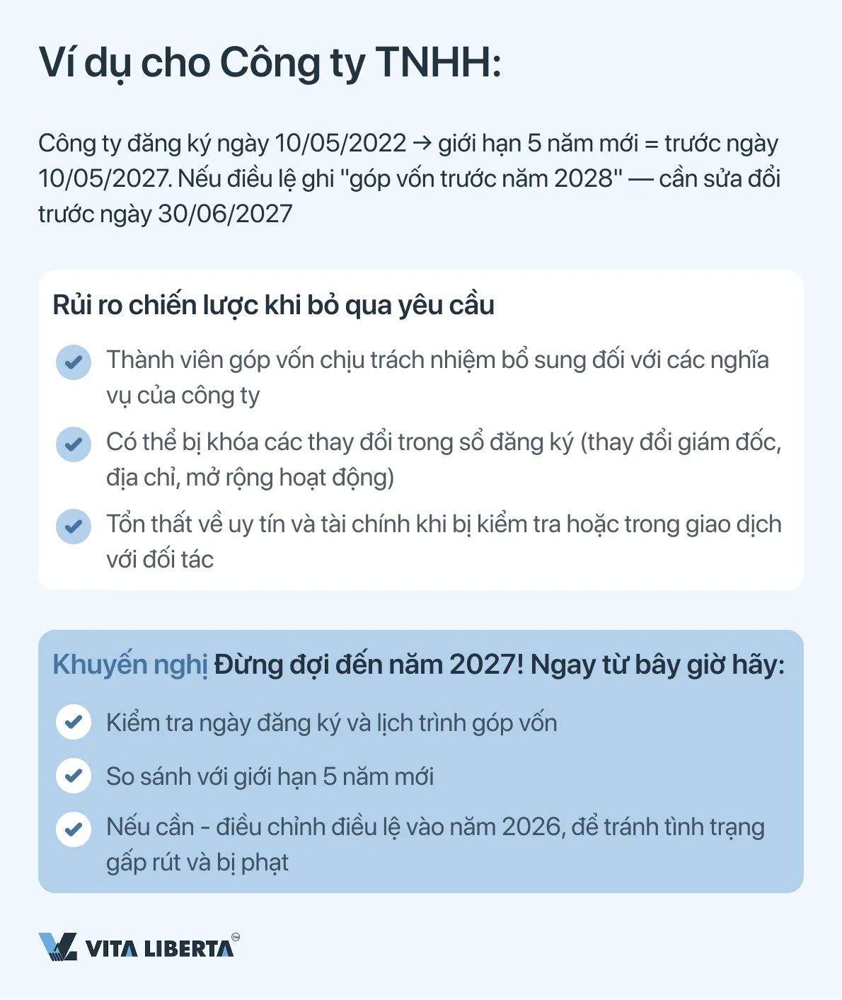 Lưu ý quan trọng: Đối với Công ty TNHH có lịch trình góp vốn hiện tại đã phù hợp với giới hạn 5 năm mới (tính từ ngày đăng ký gốc của họ) thì không bắt buộc phải sửa đổi điều lệ chính thức. Tuy nhiên, nên tiến hành kiểm tra nội bộ và có xác nhận về sự phù hợp.