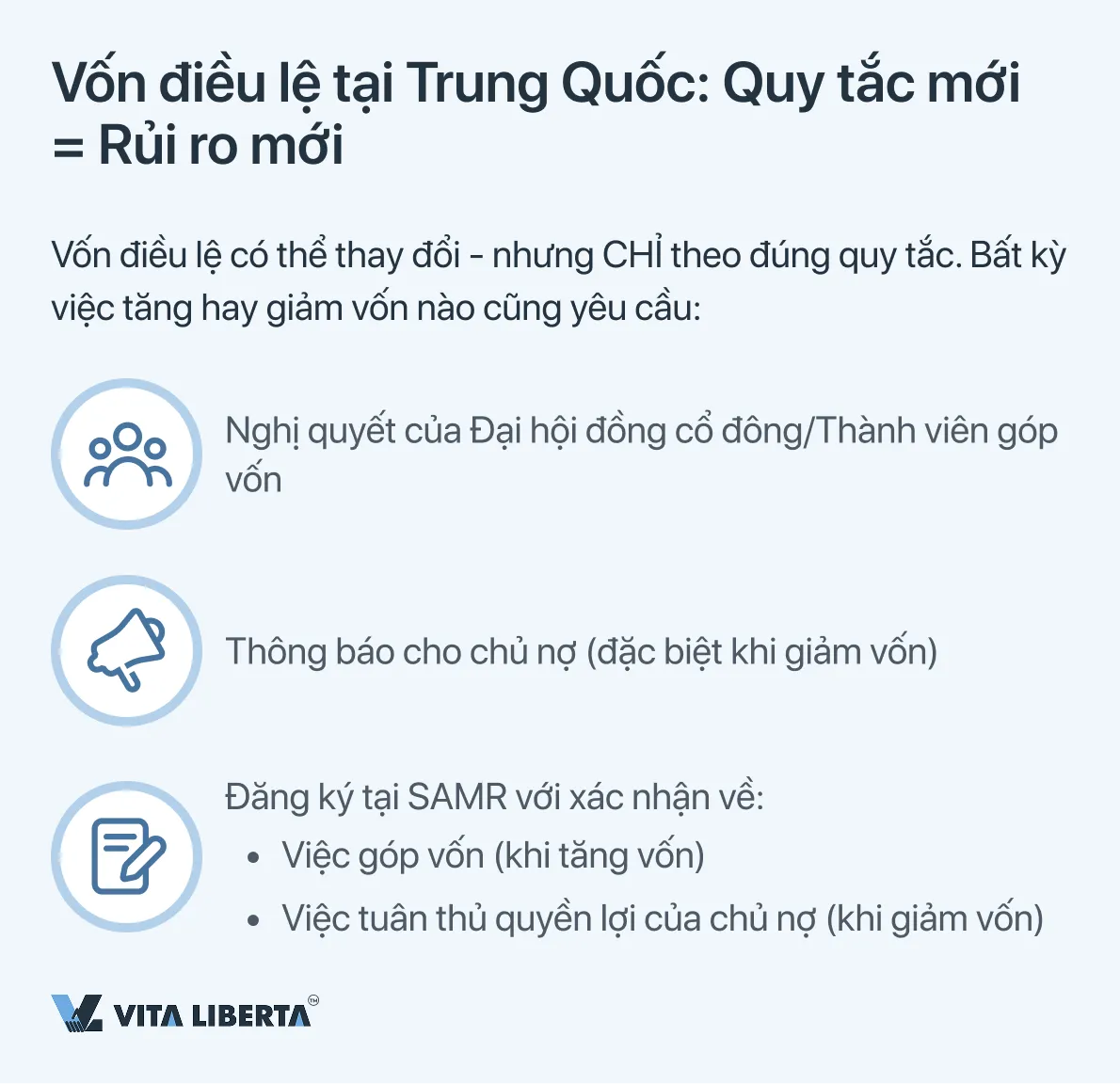 | 5. Tính công khai | Bất kỳ thay đổi nào về vốn (số tiền, hình thức, lịch trình) đều phải được công bố trên gsxt.gov.cn trong vòng 20 ngày làm việc. Đây là nền tảng cho uy tín công khai của bạn. | Chỉ định người chịu trách nhiệm cập nhật dữ liệu thường xuyên trong hệ thống. Ngân hàng và đối tác kiểm tra thông tin này đầu tiên. |