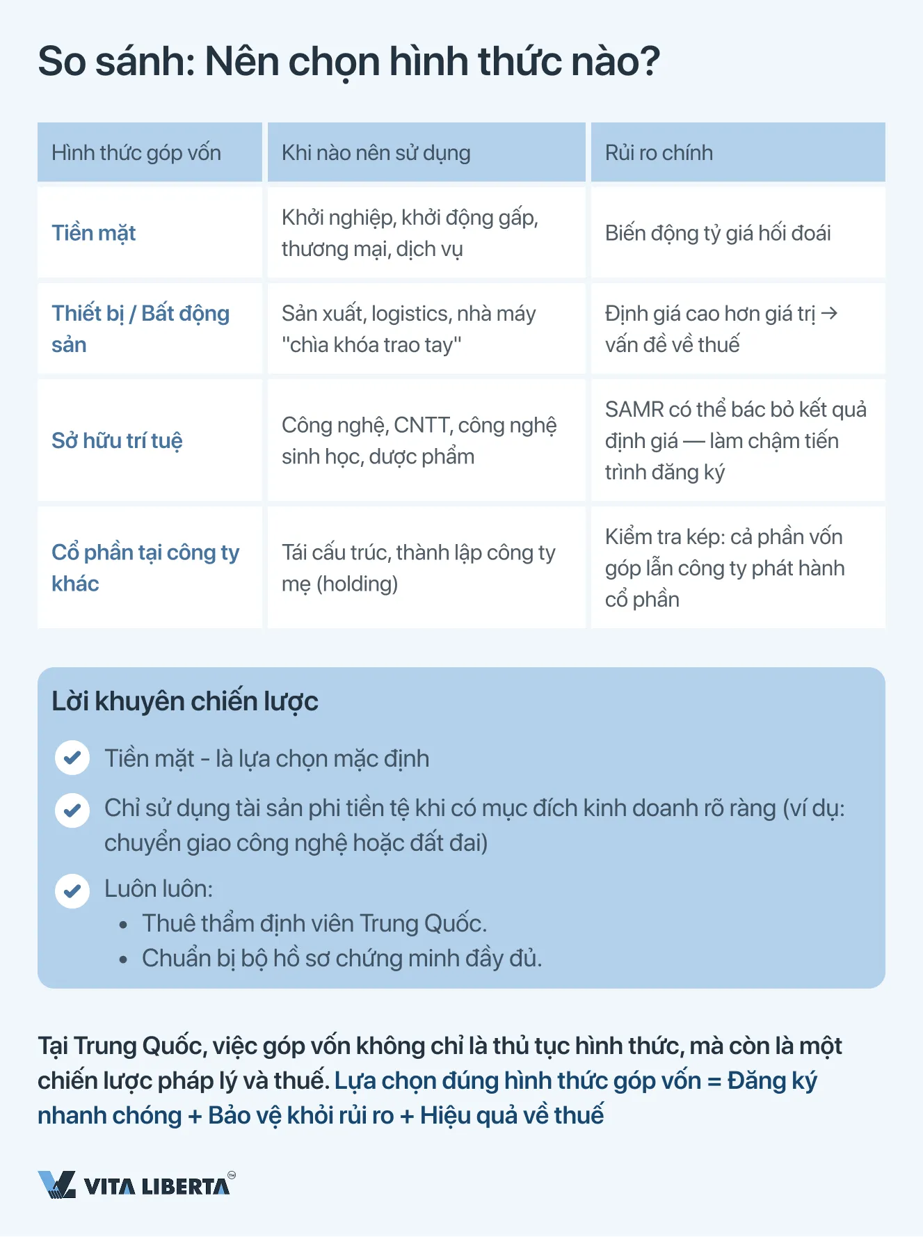 Lựa chọn hình thức góp vốn là sự cân bằng giữa mục tiêu chiến lược (trang bị cho công ty, tối ưu hóa thuế, tích hợp) và nỗ lực giảm thiểu rủi ro hành chính và pháp lý. Góp vốn phi tiền tệ, mặc dù hấp dẫn, biến quá trình đăng ký thành một quy trình dài hơn và phức tạp hơn, đòi hỏi sự tham gia của các chuyên gia địa phương để định giá độc lập và hỗ trợ pháp lý.