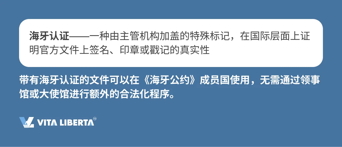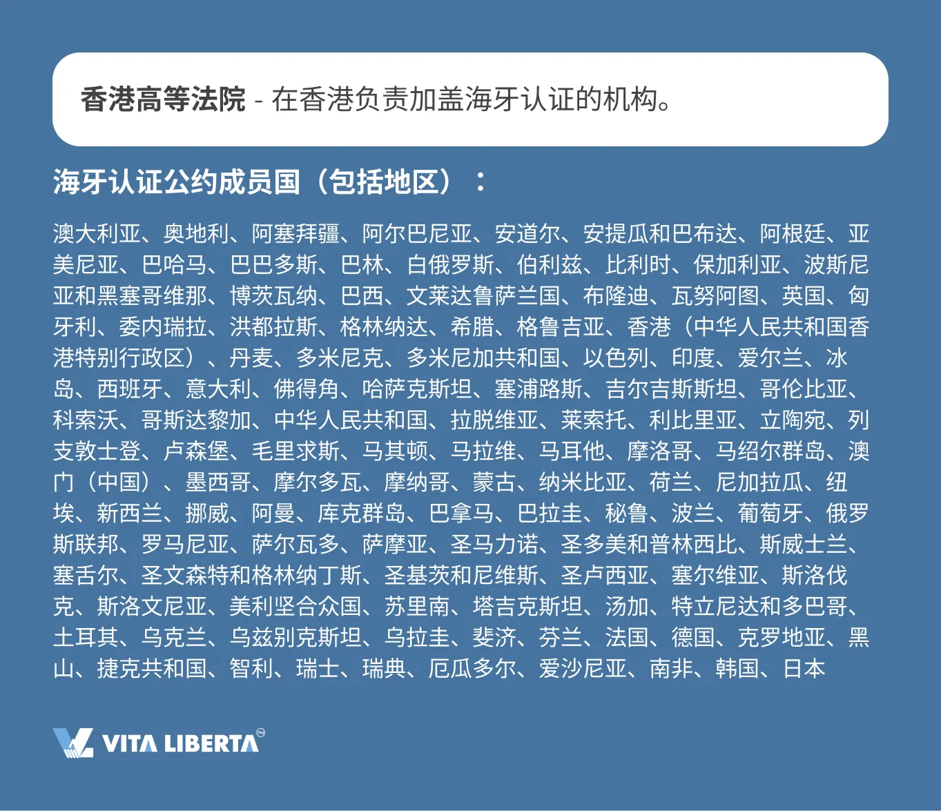 海牙认证在《海牙公约》成员国被接受。重要的是要确认计划使用文件的国家是该公约的成员国。