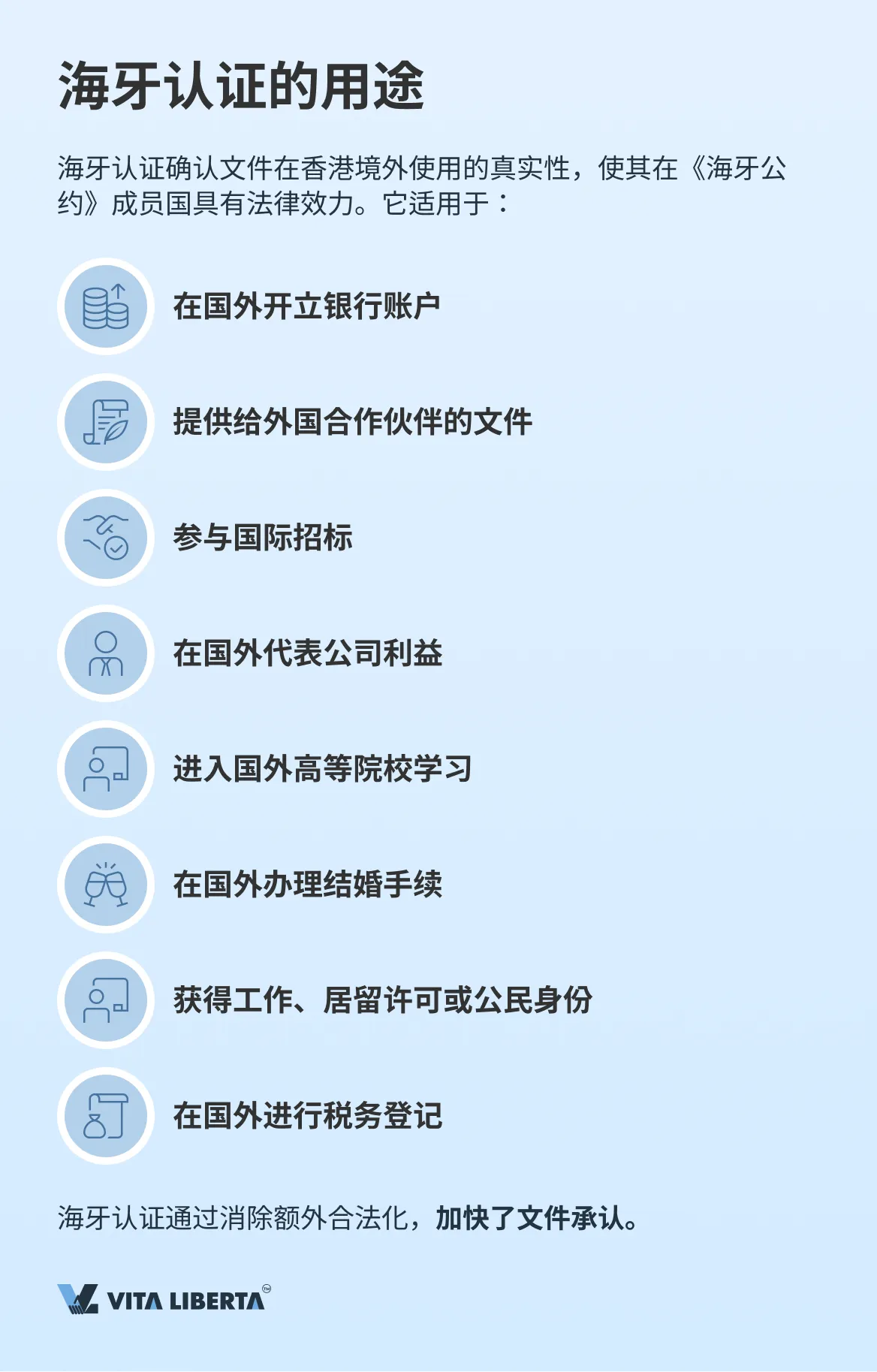 文件海牙认证对于在香港境外获得官方承认和使用是必需的。它确认文件的真实性,并使文件在签署《海牙公约》的其他国家具有法律效力。需要海牙认证的主要情况包括: