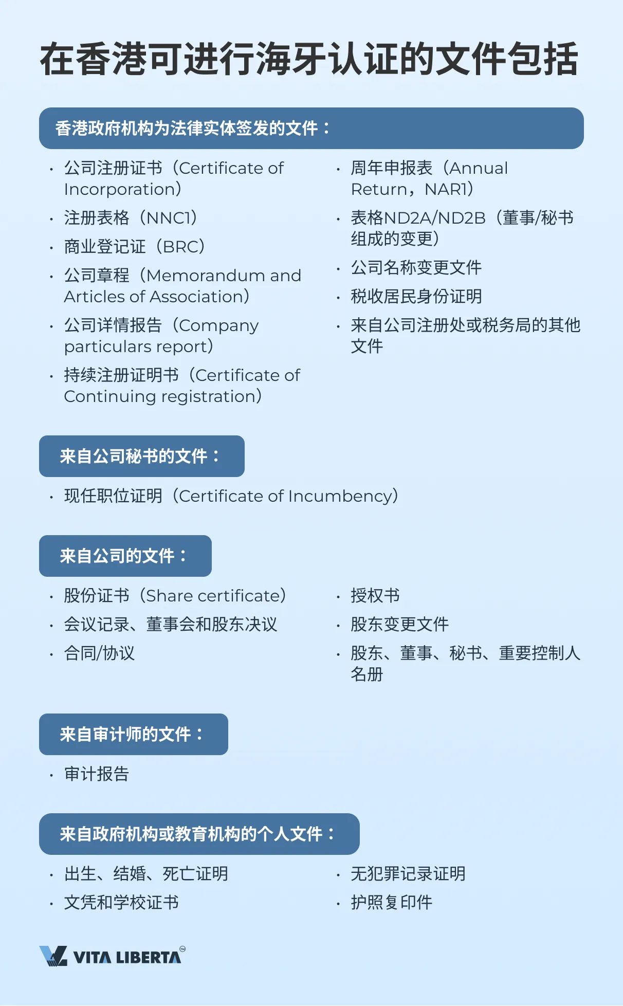 - 由签发文件的政府机构认证文件并在香港高等法院加盖海牙认证。