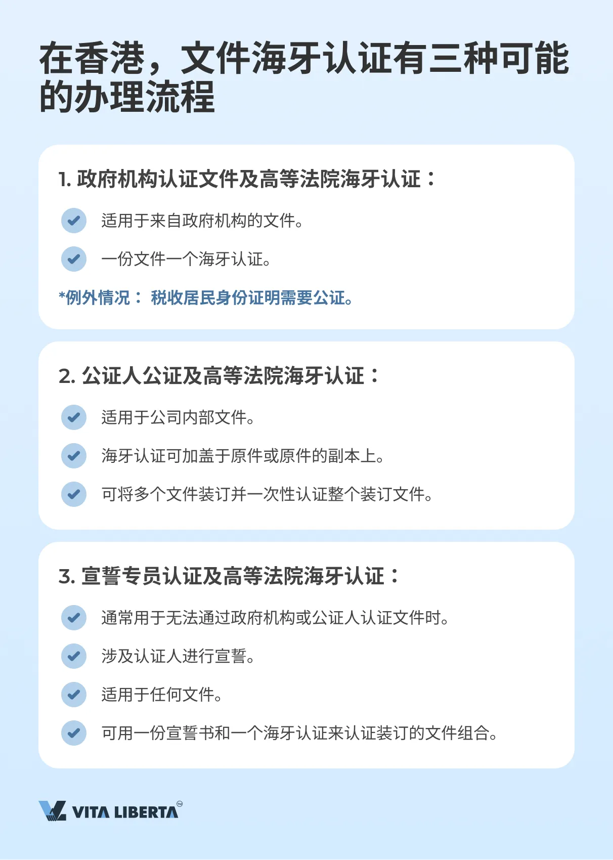 在香港,主要有3(三)种方式可以对文件进行海牙认证: