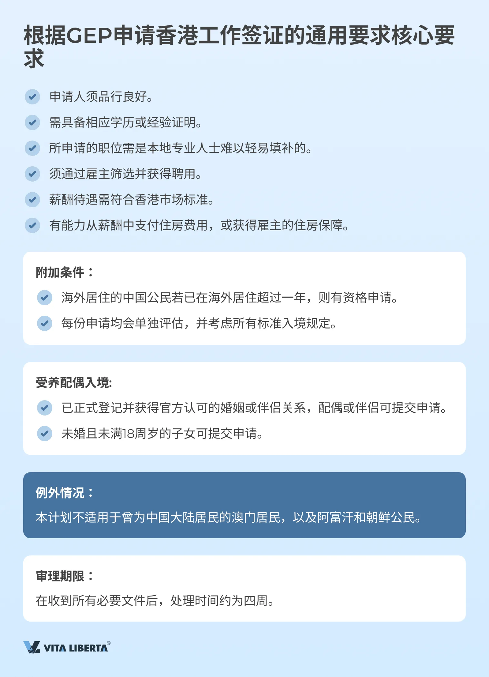 申请GEP签证需满足以下条件:具备高等教育学历或高级专业技能,获得香港公司的聘用,薪酬符合香港市场标准,且无犯罪记录。此外,雇主需证明该职位无法由本地专业人员填补。