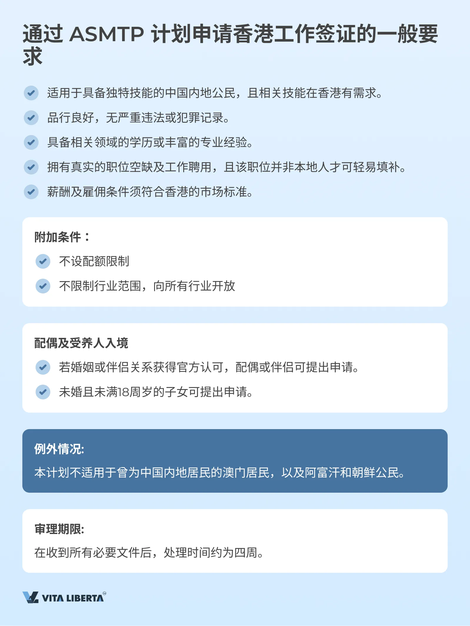 ASMTP旨在吸引中国内地的专业人才,支持对香港经济至关重要的关键行业。通过ASMTP申请签证需证明具备相关工作经验及该职位所需的资格。