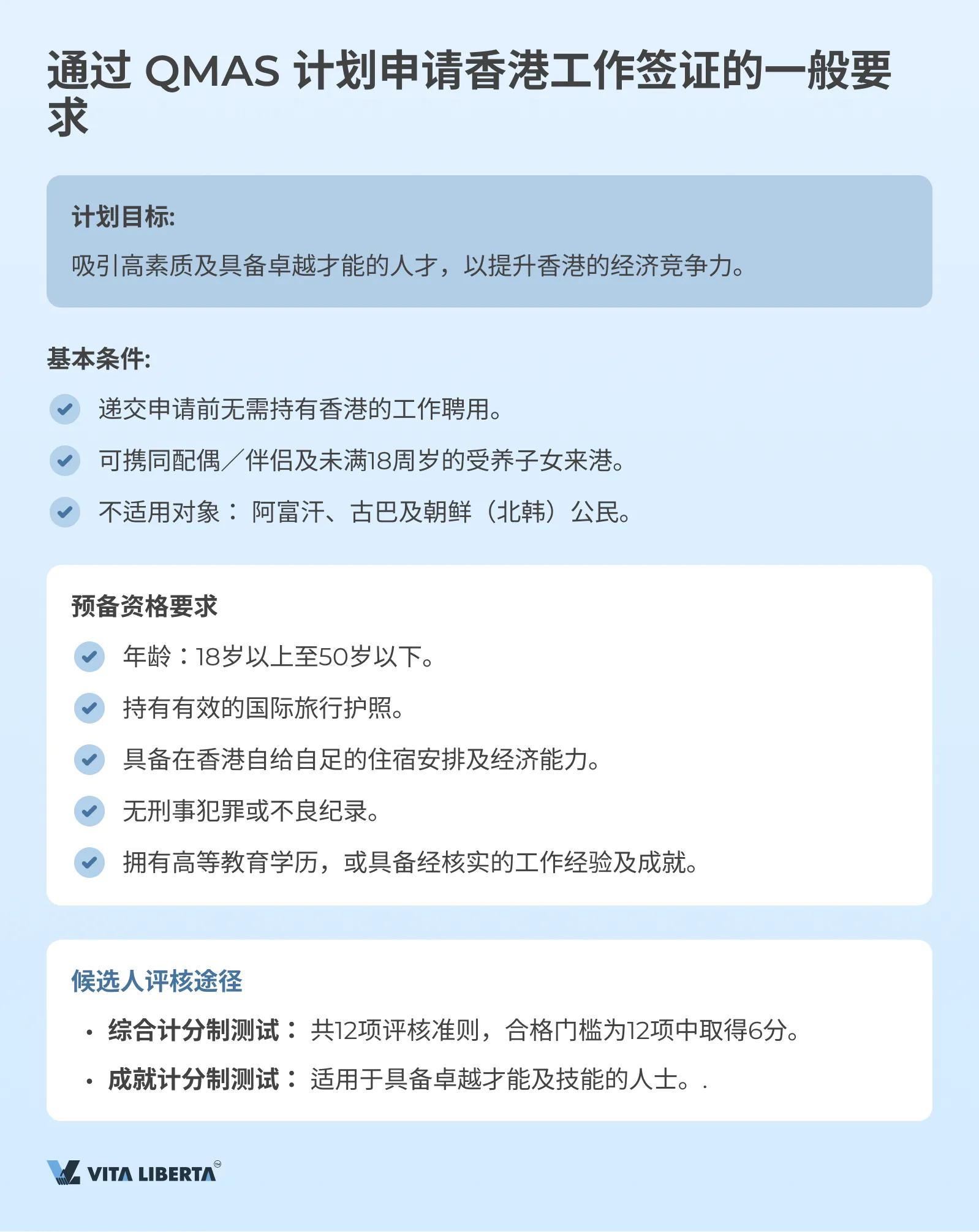 QMAS采用计分制,评估因素包括学历、专业经验及语言能力等。该计划面向能为香港发展做出贡献的高素质人才。QMAS的优势在于,申请人无需事先获得雇主聘用即可申请签证。