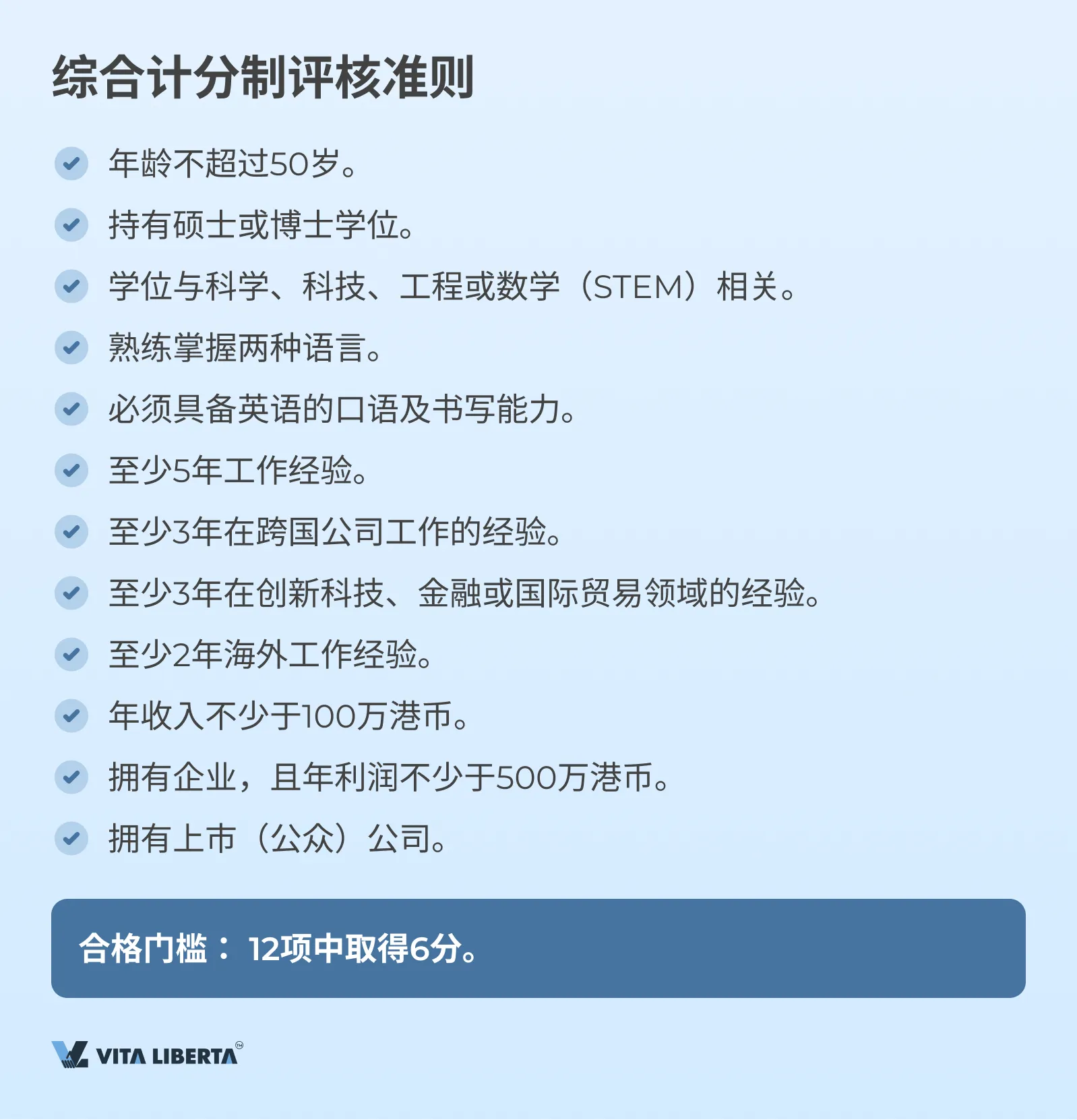 综合计分制包含12项评核准则;成就计分制则包含2项。综合计分制设有最低合格分数,申请人于递交申请前应自行评估是否达到要求。
